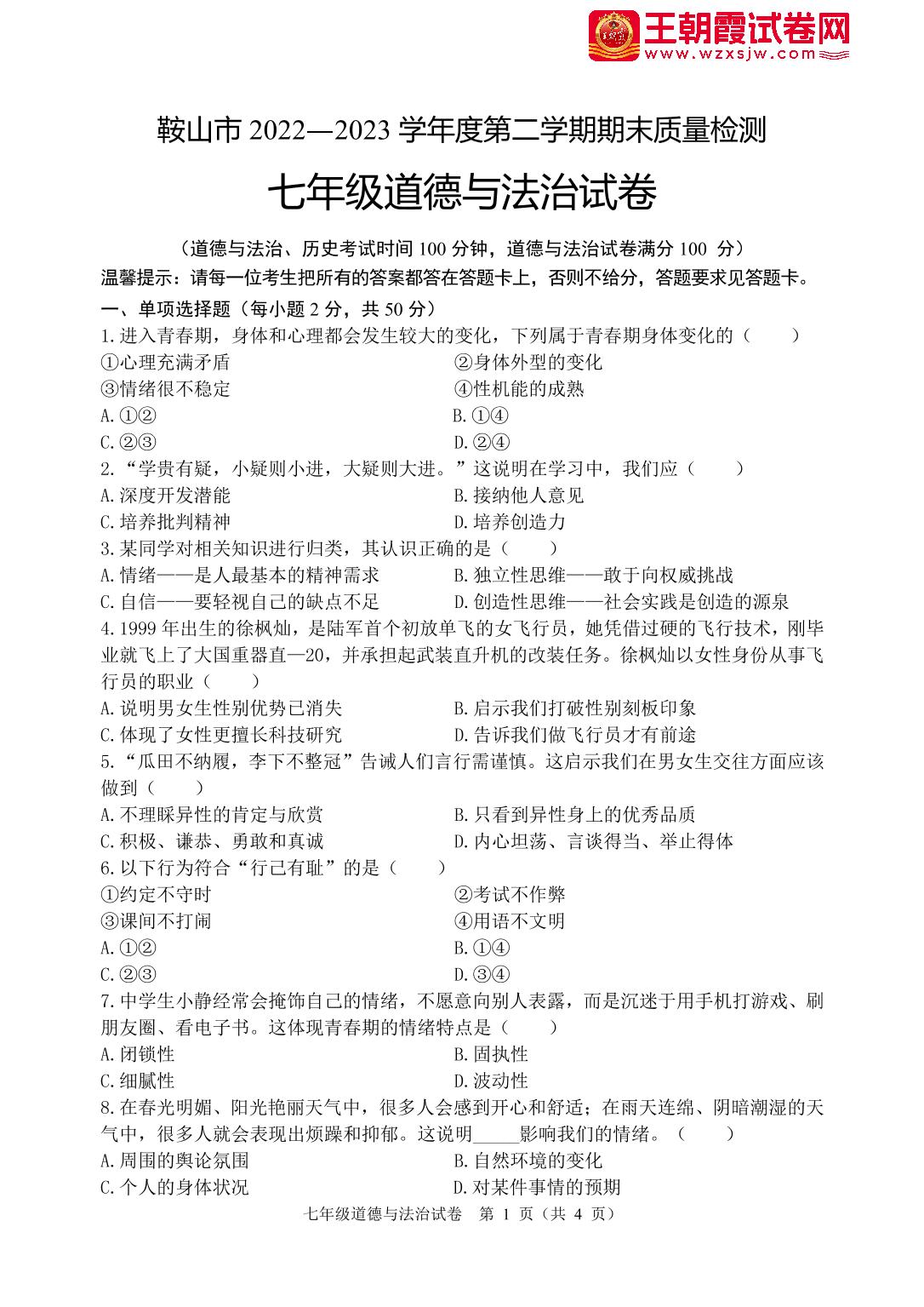 辽宁省鞍山市2022-2023学年度第二学期期末质量检测七年级道德与法治(人教版)