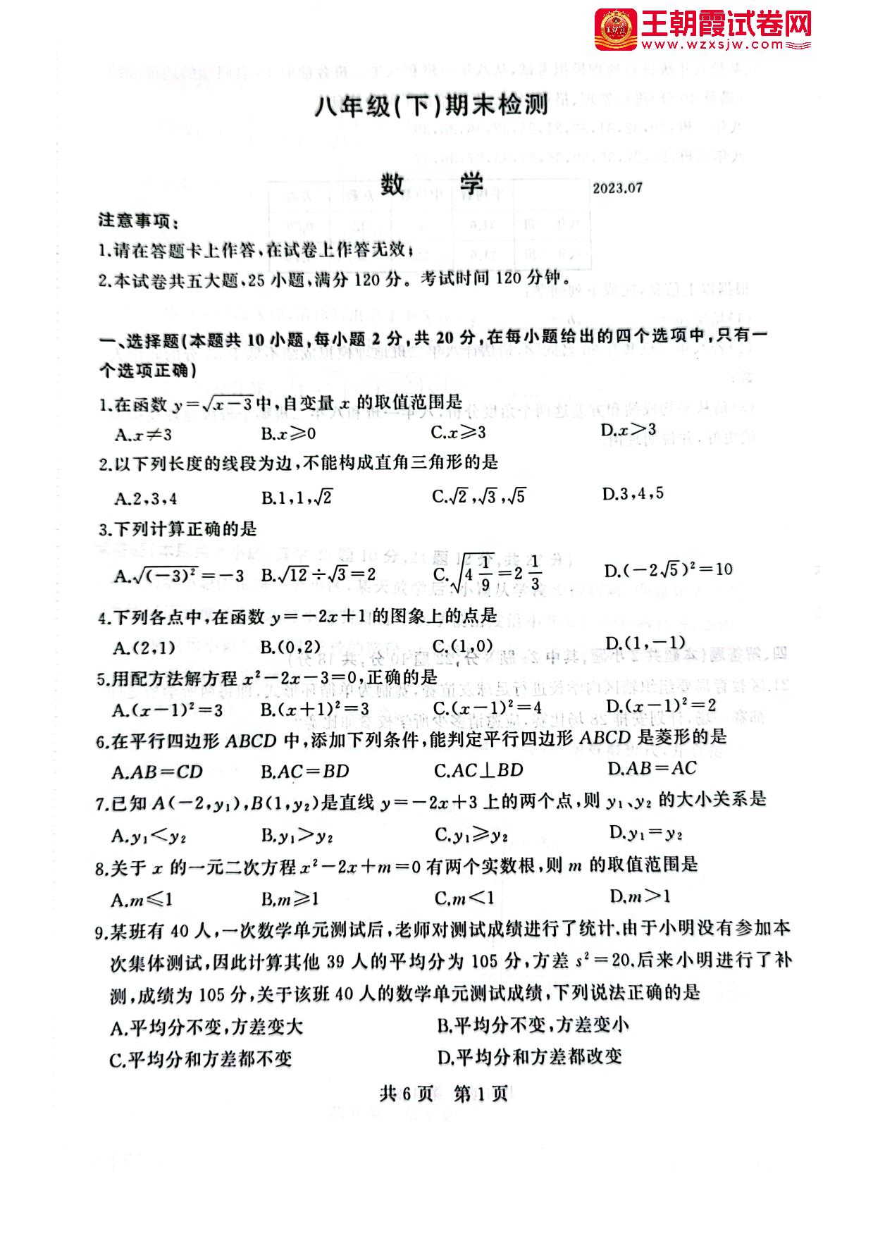 辽宁省大连市高新园区2022-2023学年下学期期末检测八年级数学(人教版)