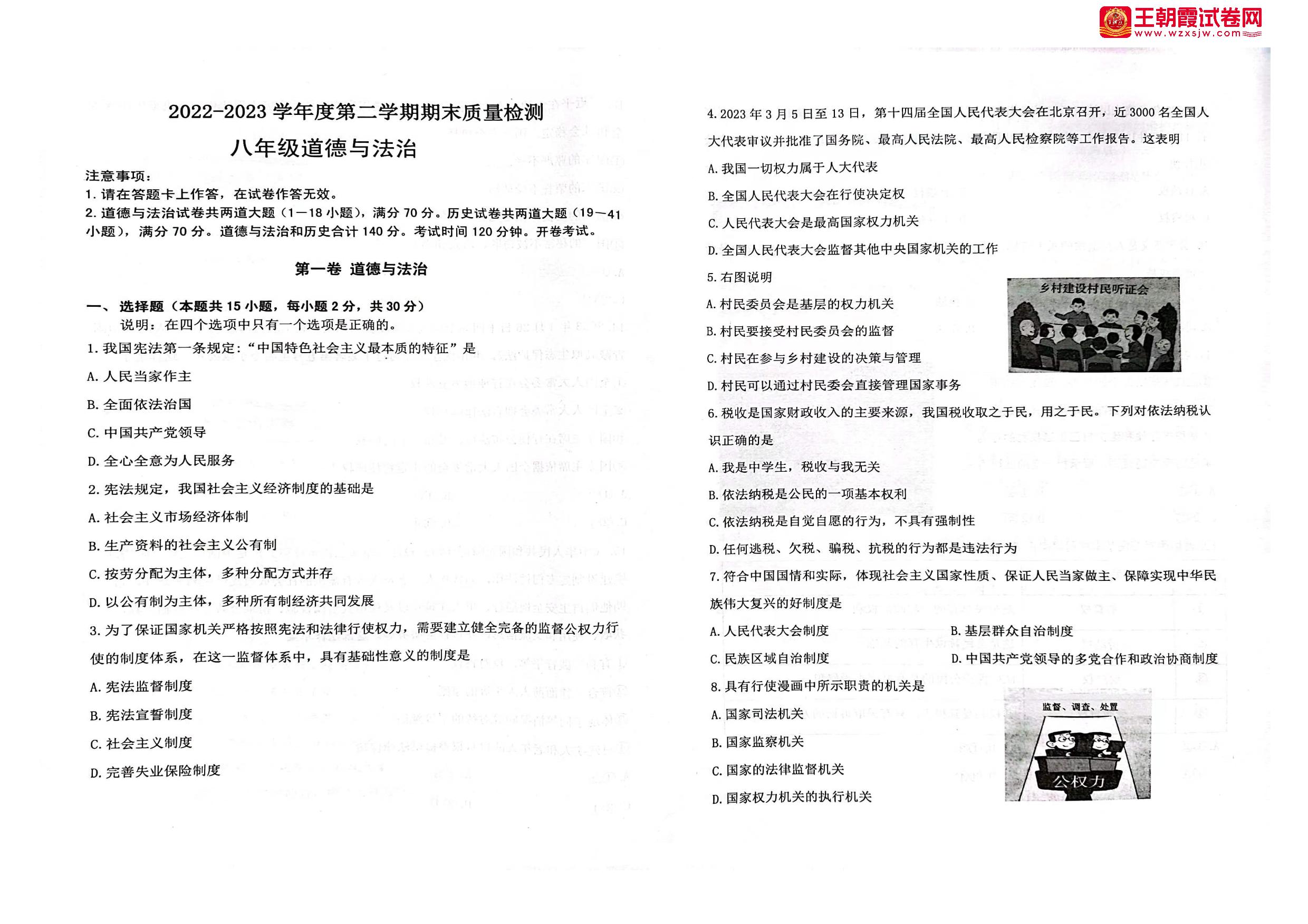辽宁省大连市中山区2022-2023学年度第二学期期末质量检测八年级道德与法治(人教版)