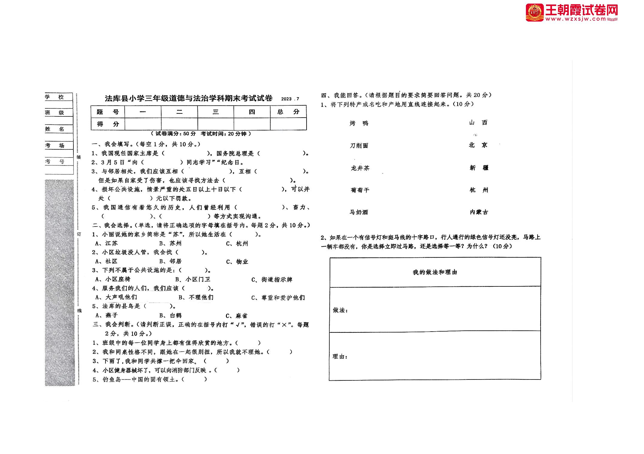 辽宁省沈阳市法库县2022-2023学年下学期期末考试三年级道德与法治(人教版)