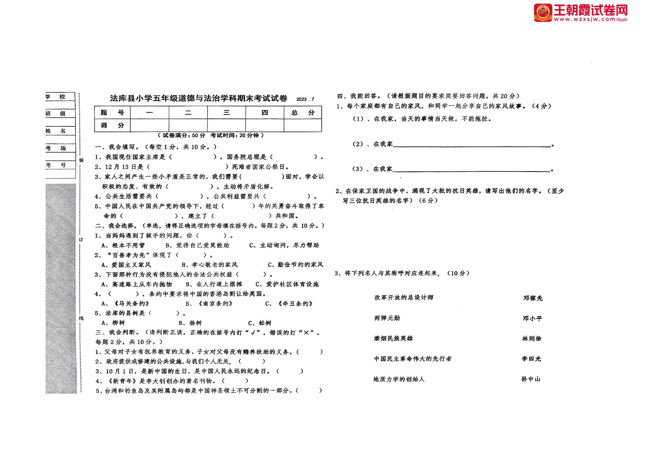 五年级道德与法治人教版下册期末卷