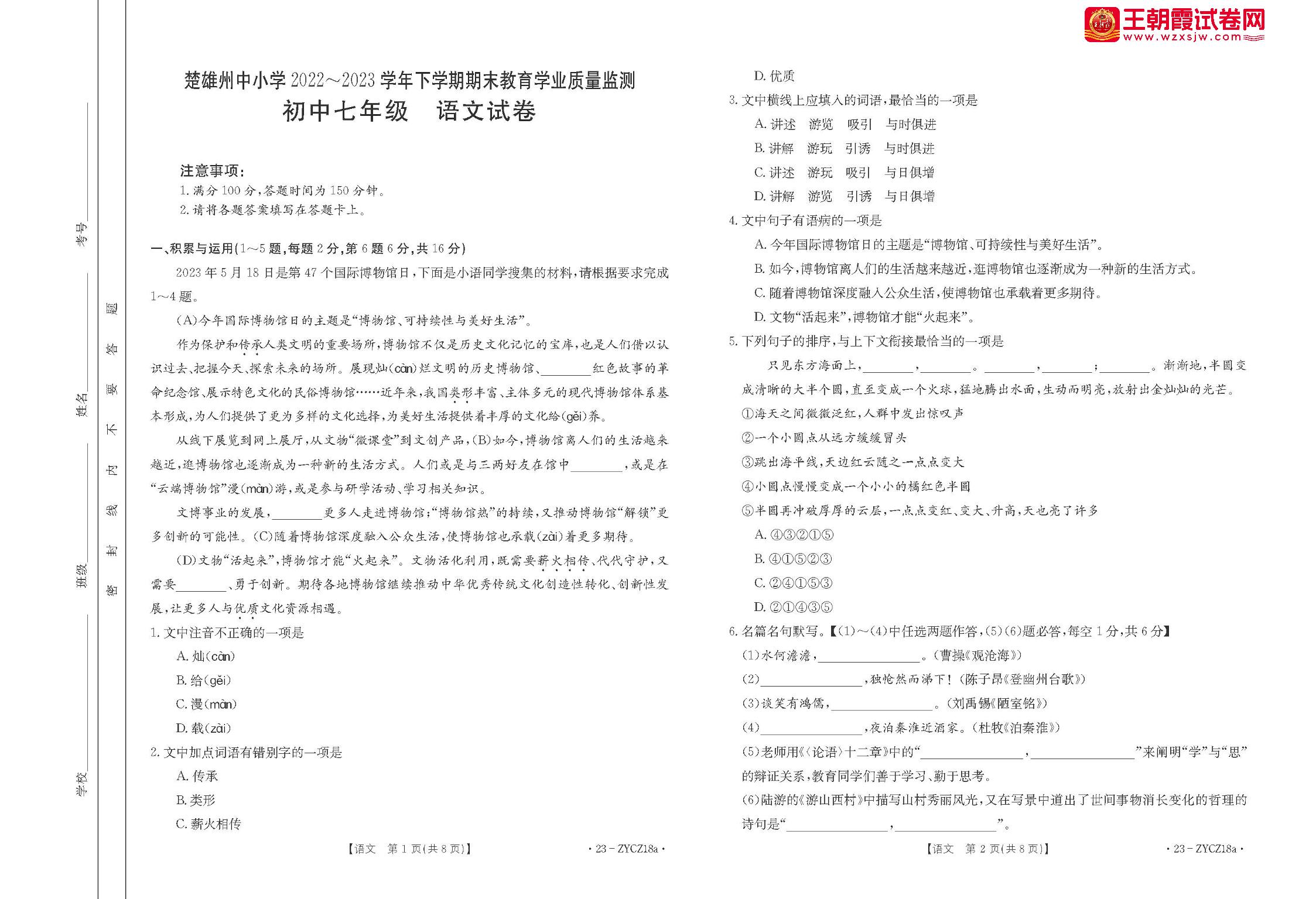 云南省楚雄彝族自治州2022-2023学年下学期期末教育学业质量监测试卷七年级语文(人教版)
