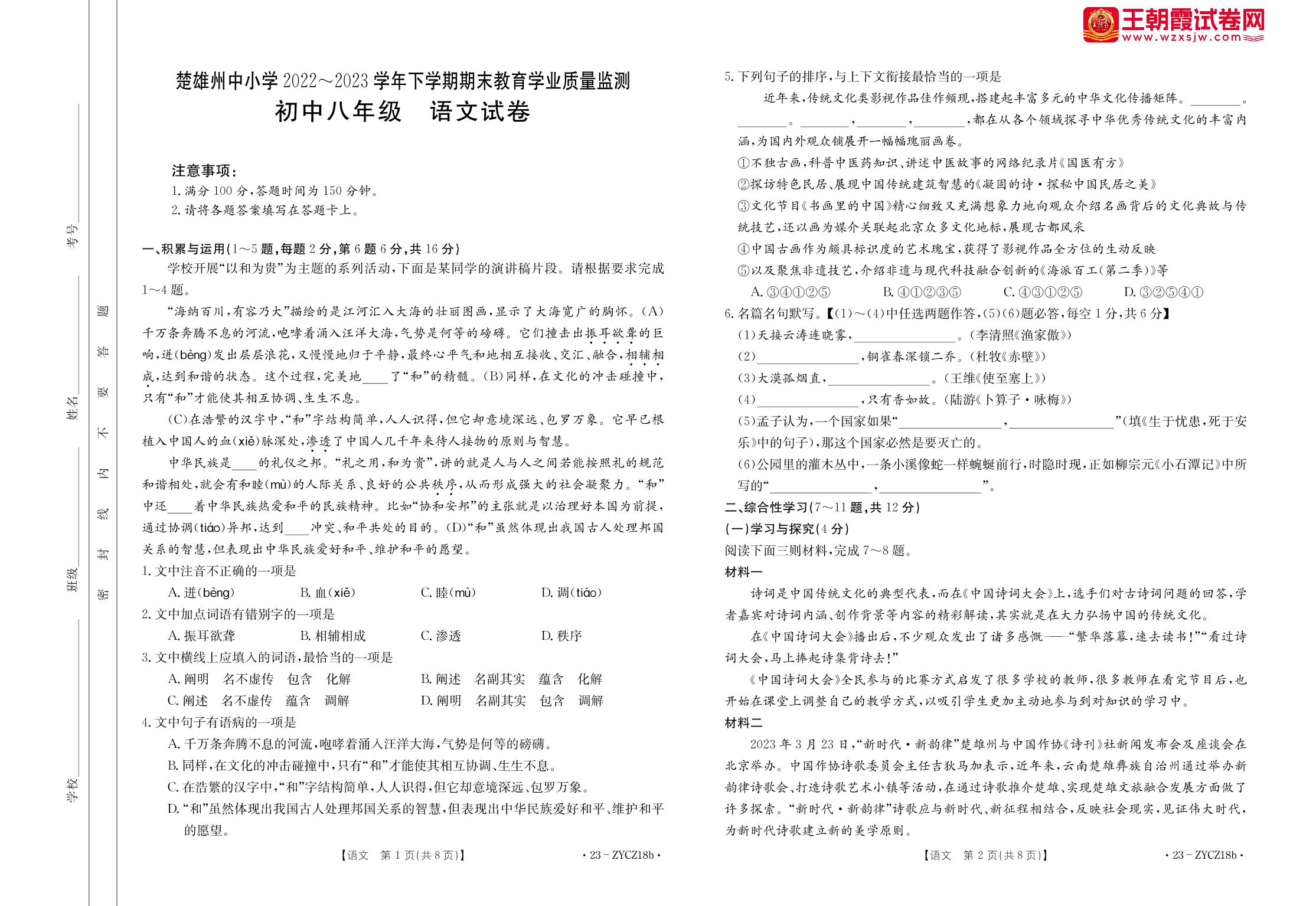 云南省楚雄彝族自治州2022-2023学年下学期期末教育学业质量监测试卷八年级语文(人教版)