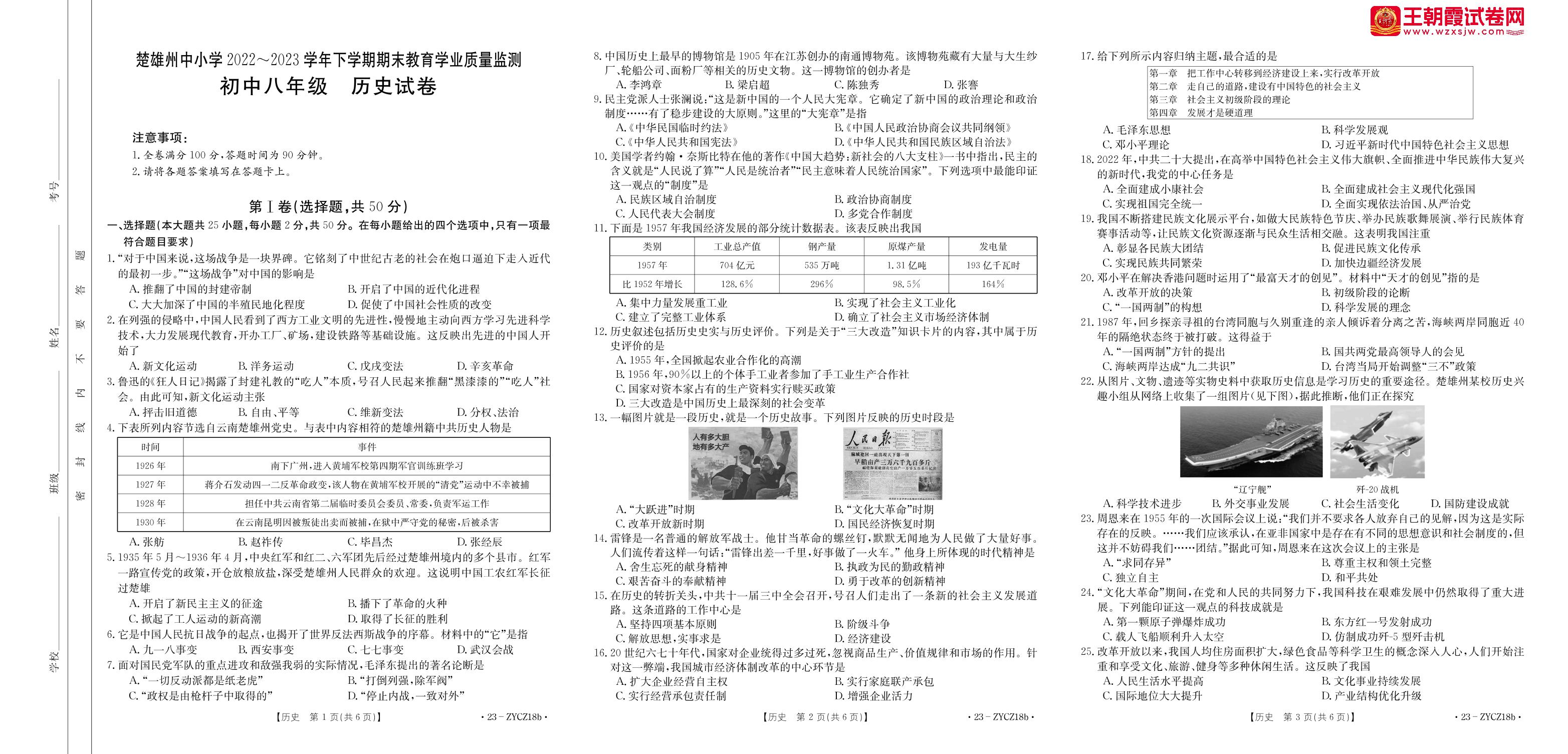云南省楚雄彝族自治州2022-2023学年下学期期末教育学业质量监测试卷八年级历史(人教版)