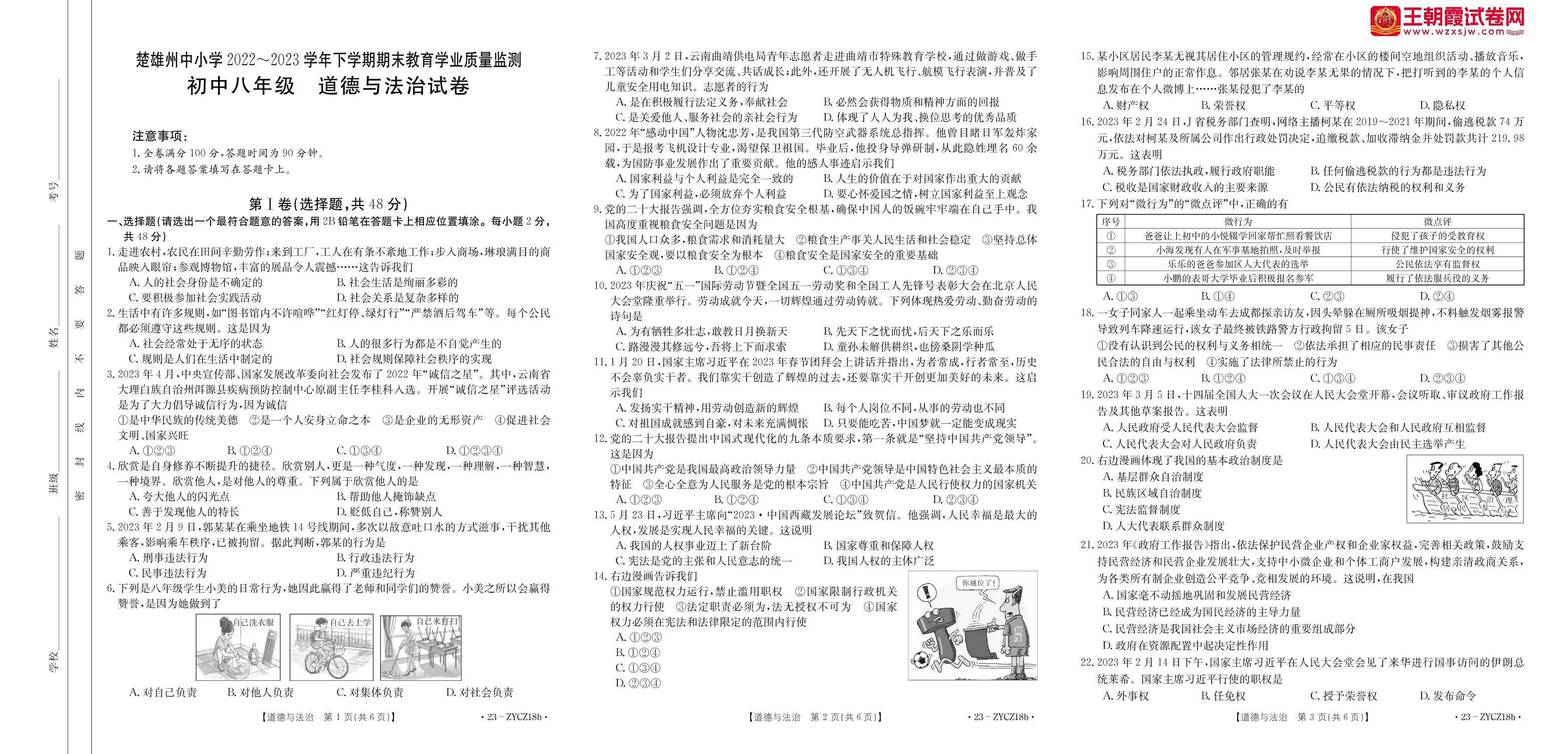 云南省楚雄彝族自治州2022-2023学年下学期期末教育学业质量监测试卷八年级道德与法治(人教版)