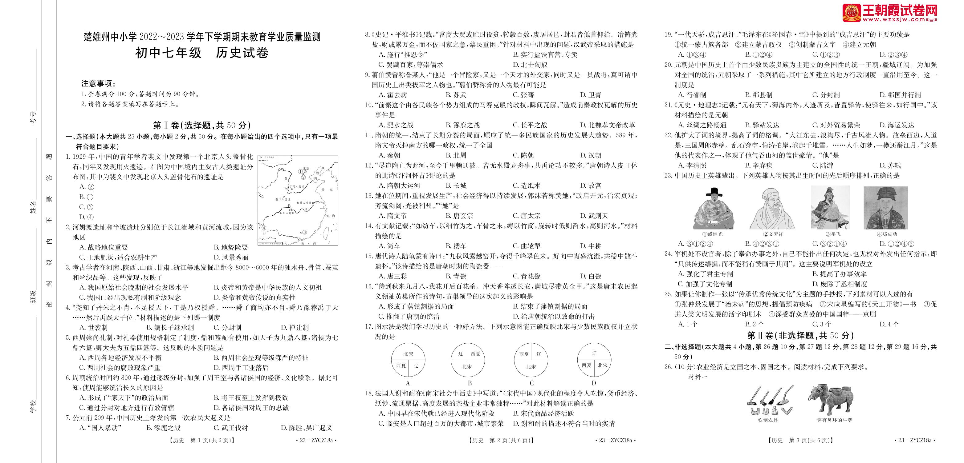 云南省楚雄彝族自治州2022-2023学年下学期期末教育学业质量监测试卷七年级历史(人教版)