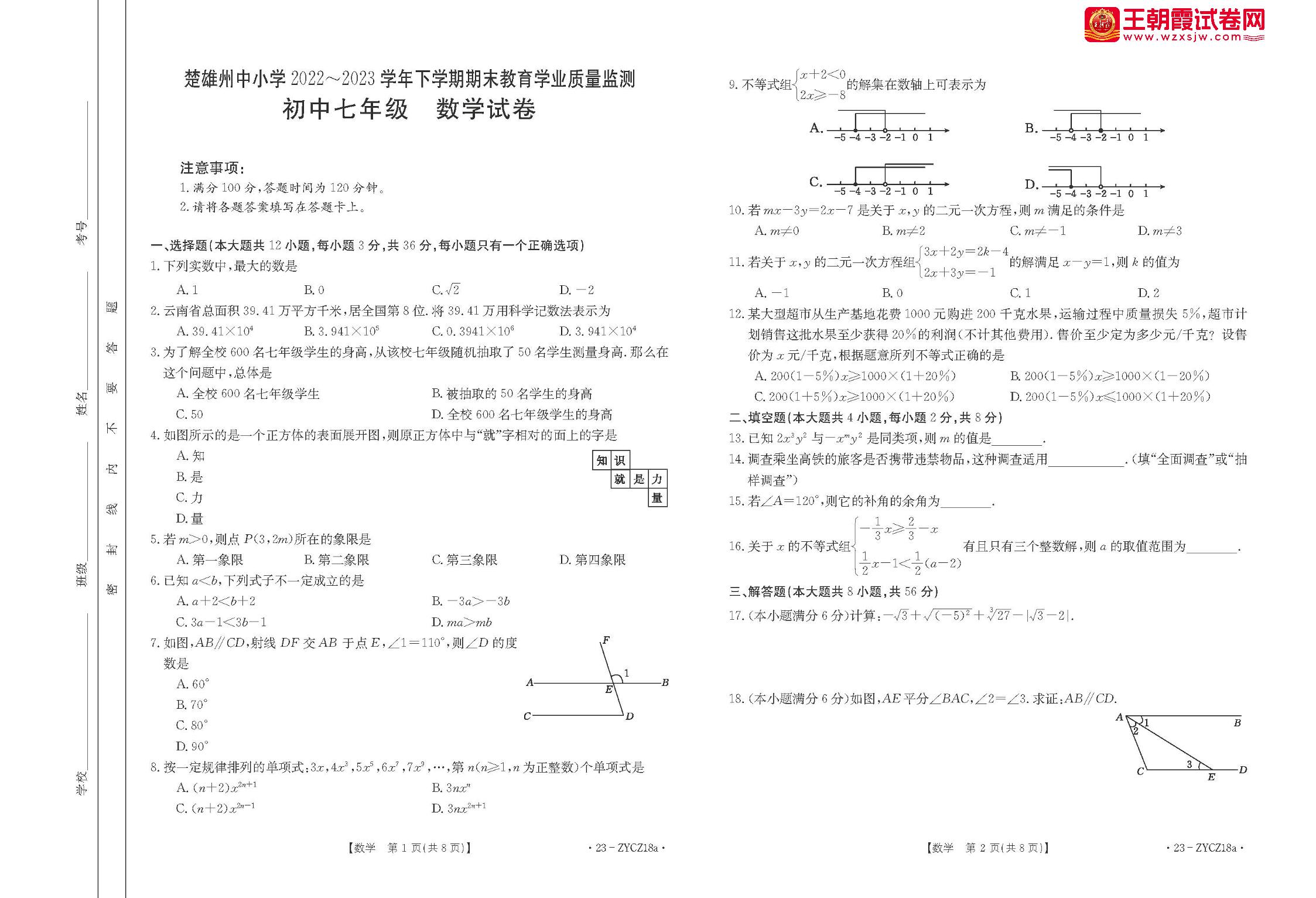 云南省楚雄彝族自治州2022-2023学年下学期期末教育学业质量监测试卷七年级数学(人教版)