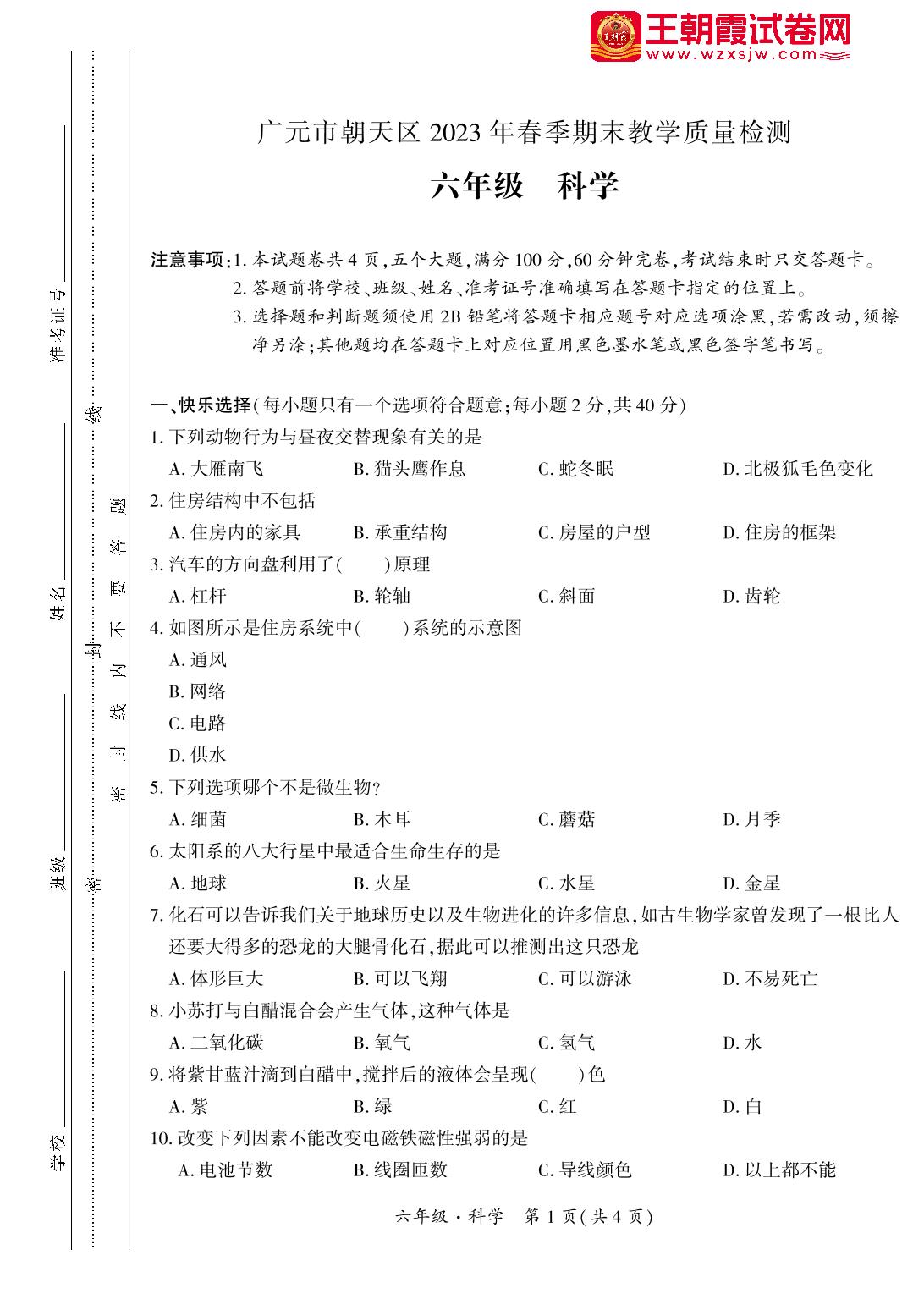 四川省广元市朝天区2022-2023学年度第二学期期末教学质量检测试卷六年级科学(教科版)