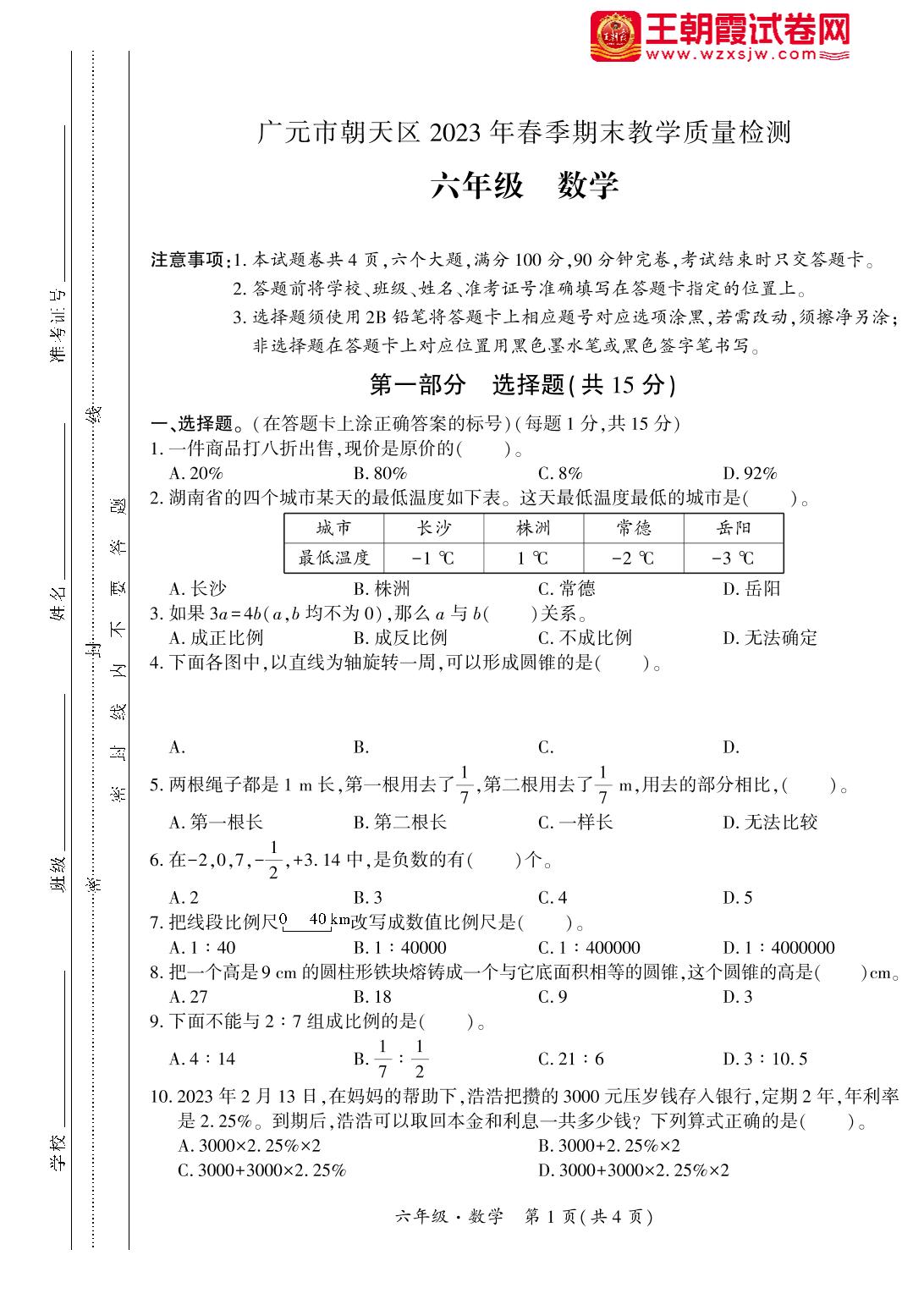 四川省广元市朝天区2022-2023学年度第二学期期末教学质量检测试卷六年级数学(人教版)