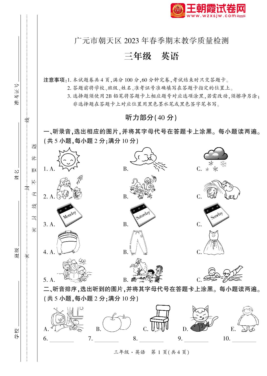 四川省广元市朝天区2022-2023学年度第二学期期末教学质量检测试卷三年级英语(外研版)
