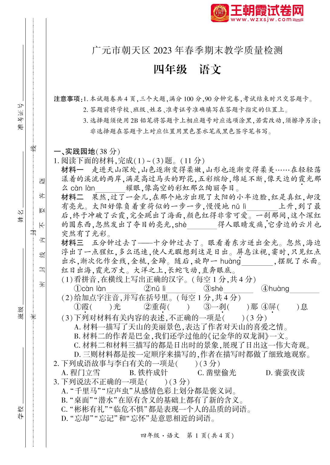 四川省广元市朝天区2022-2023学年度第二学期期末教学质量检测试卷四年级语文(人教版)