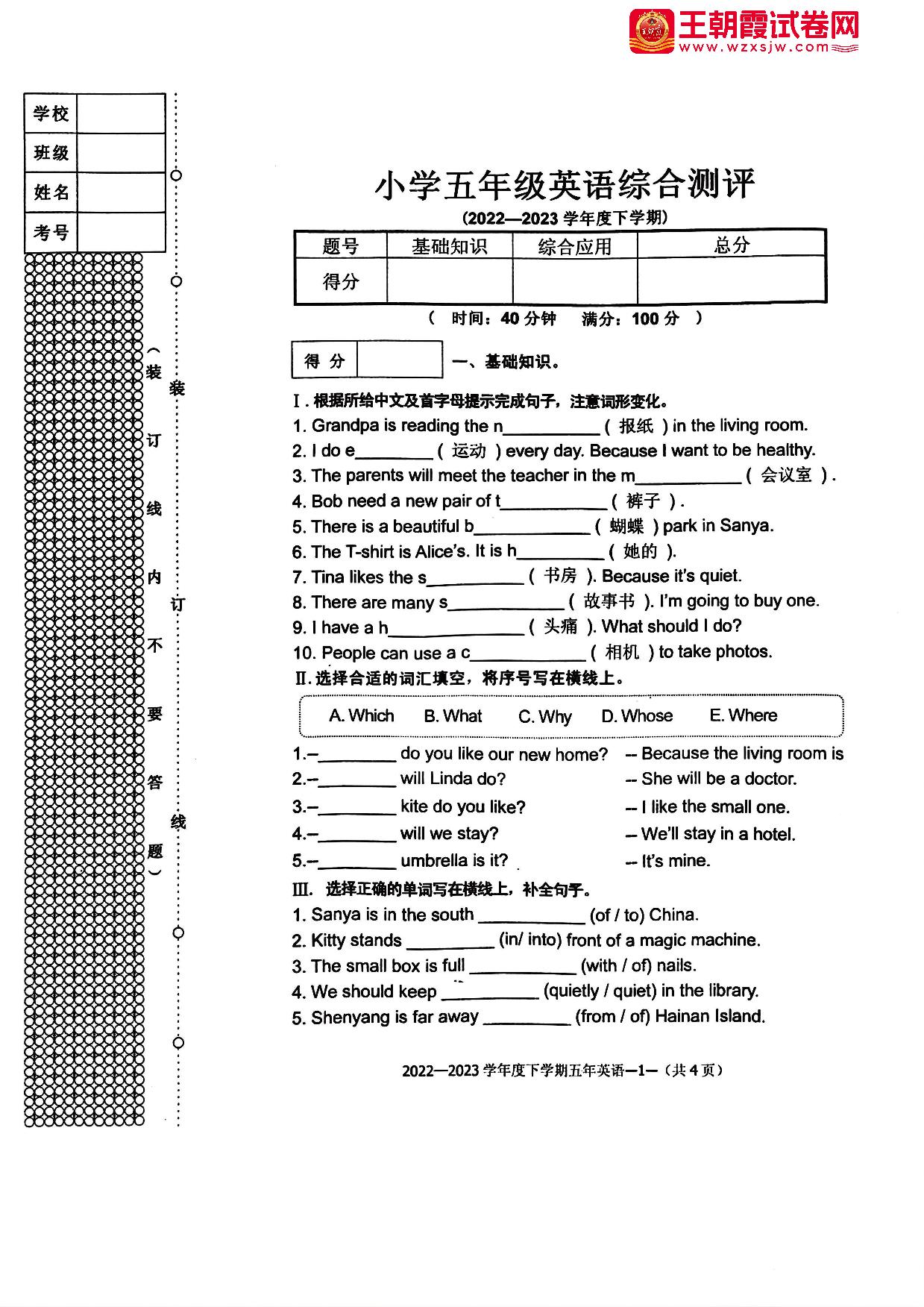 辽宁省沈阳市皇姑区2022-2023学年度下学期期末综合测评五年级英语(沪教版)
