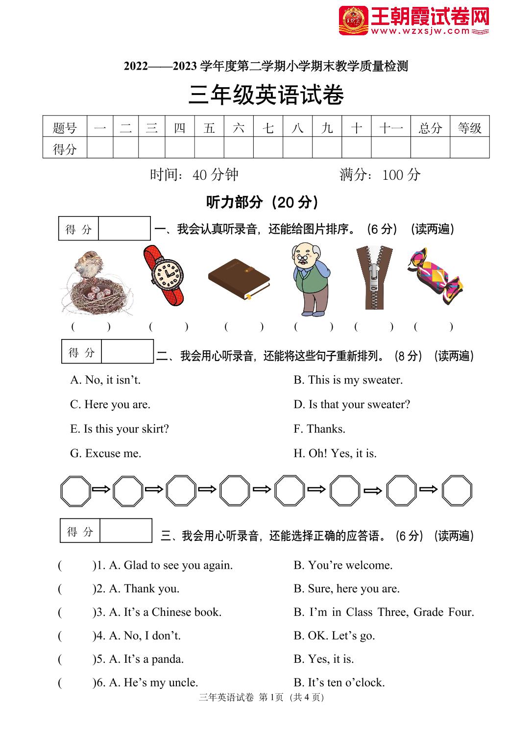 三年级英语人教PEP版(三起始)下册期末卷