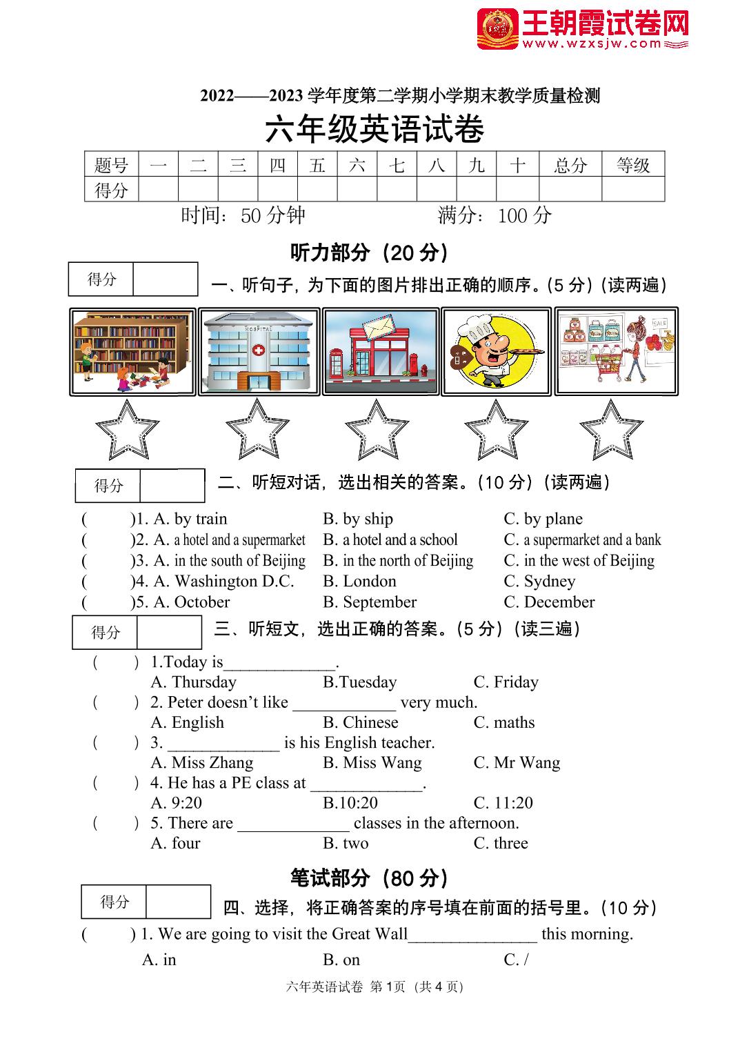 辽宁省抚顺市新抚区2022-2023学年度第二学期期末教学质量检测六年级英语(人教PEP版)【无听力音频】