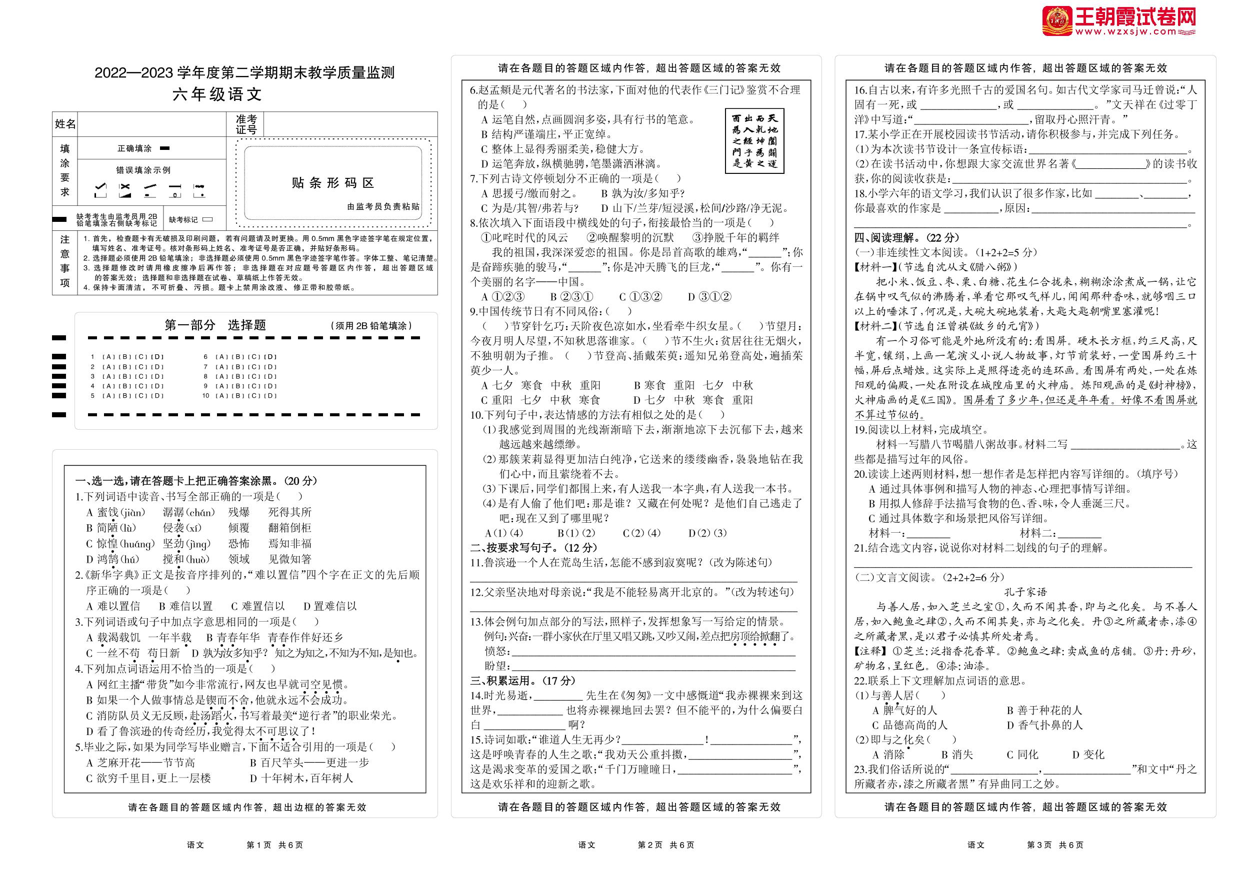 辽宁省葫芦岛市绥中县2022-2023学年度第二学期期末教学质量监测六年级语文(人教版)