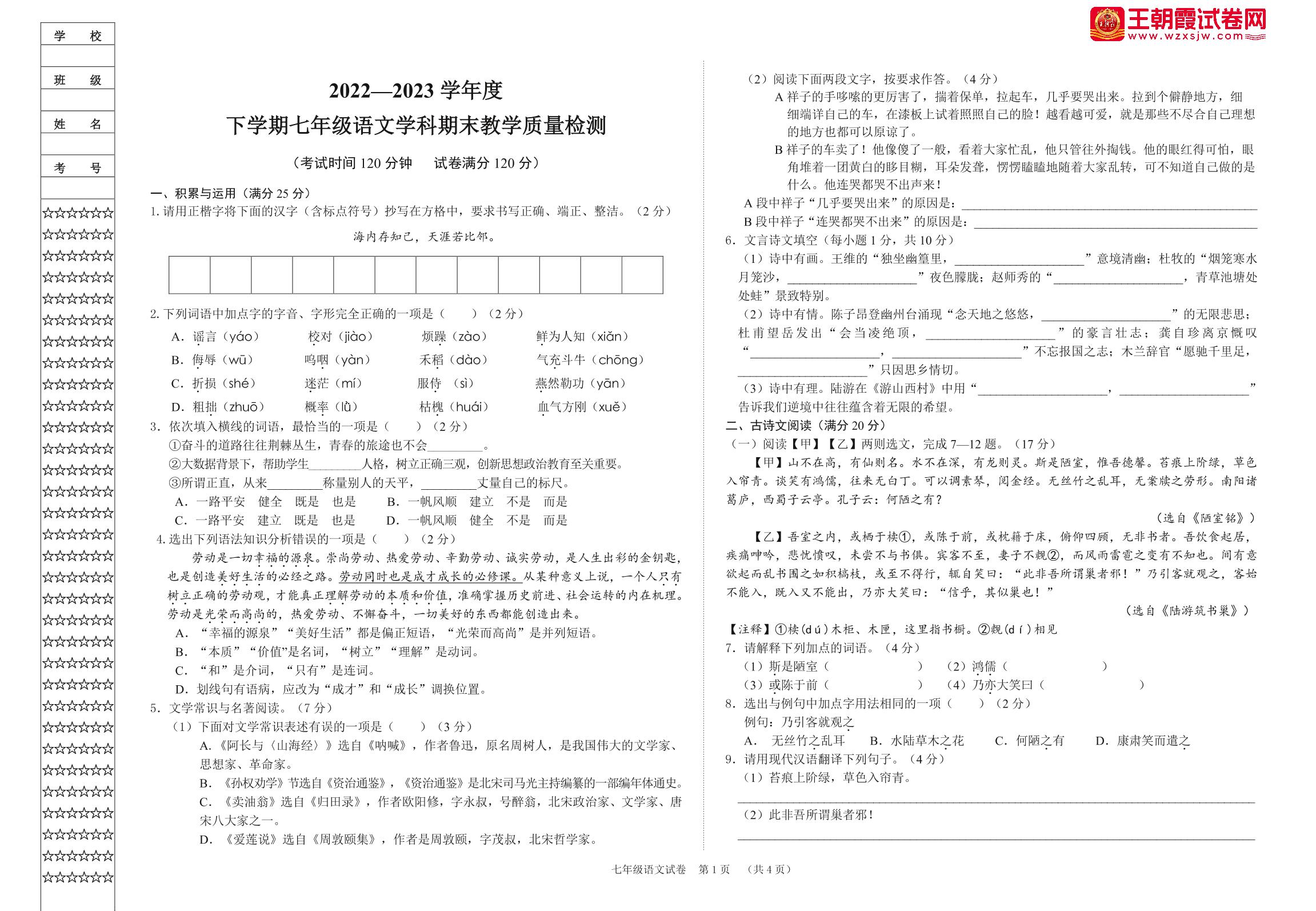 辽宁省营口市大石桥市2022-2023学年度下学期期末教学质量检测七年级语文(人教版)