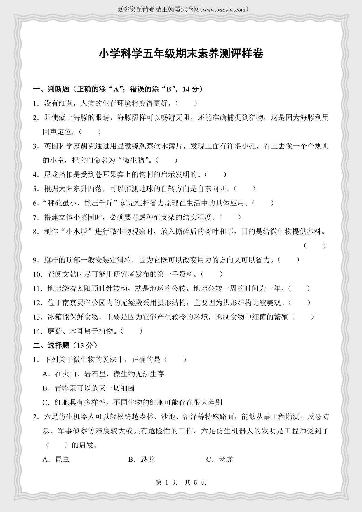 江苏省南京市江宁区2022-2023学年下学期期末素养测评样卷五年级科学(苏教版)