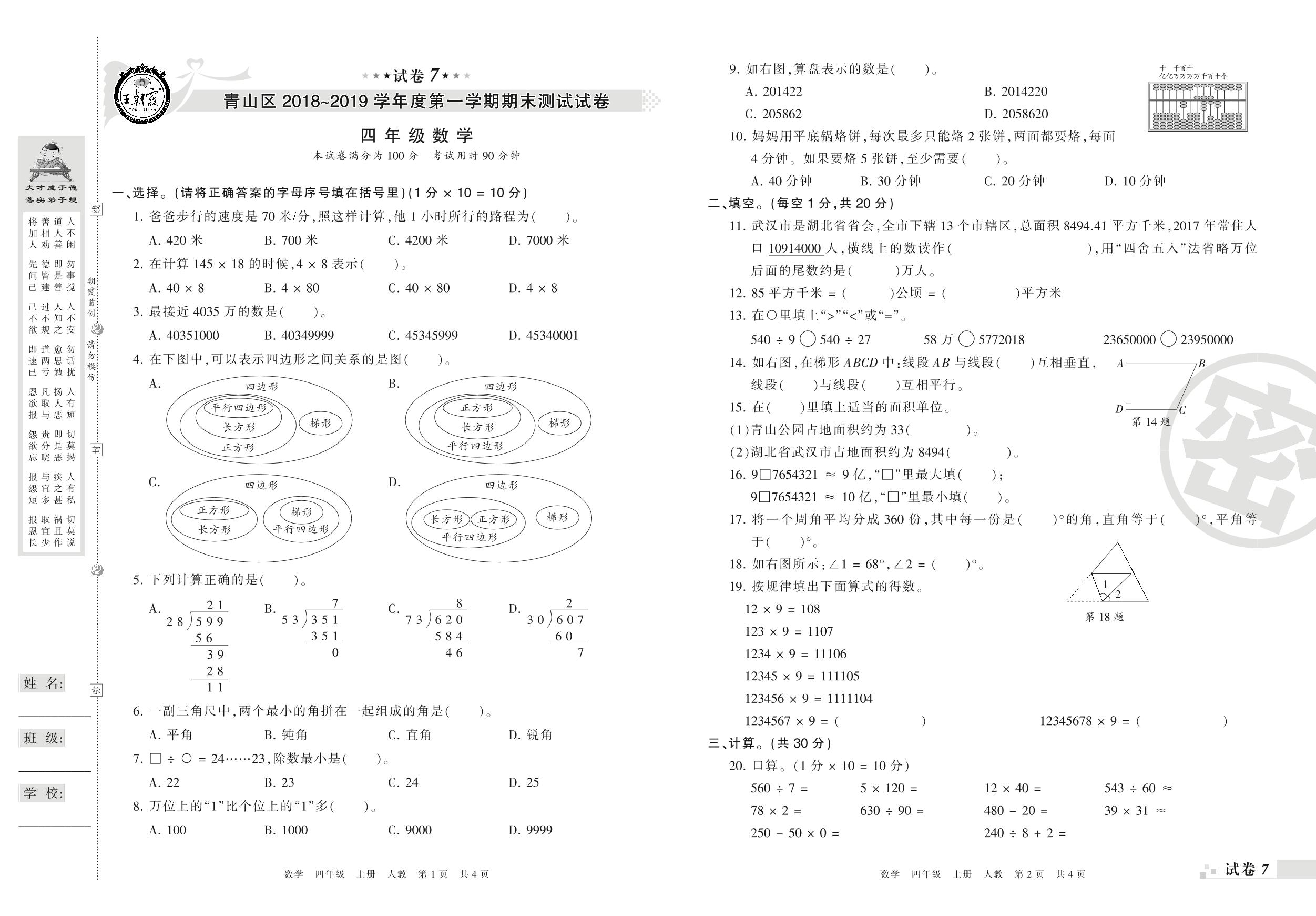2018-2019学年第一学期武汉市青山区四年级数学试卷(人教版)【7】