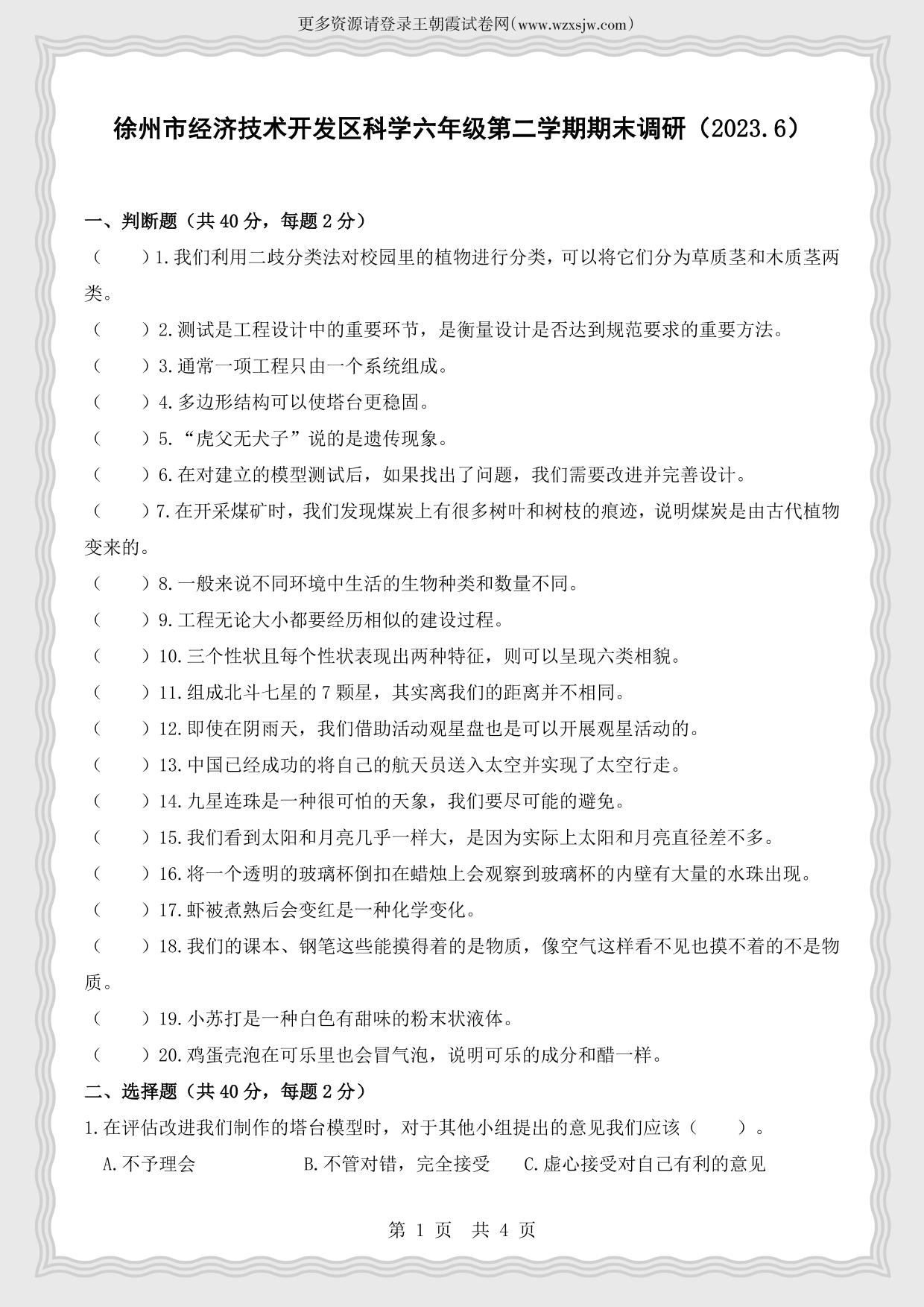 江苏省徐州市经济技术开发区某联盟校2022-2023学年第二学期期末调研试卷六年级科学(教科版)