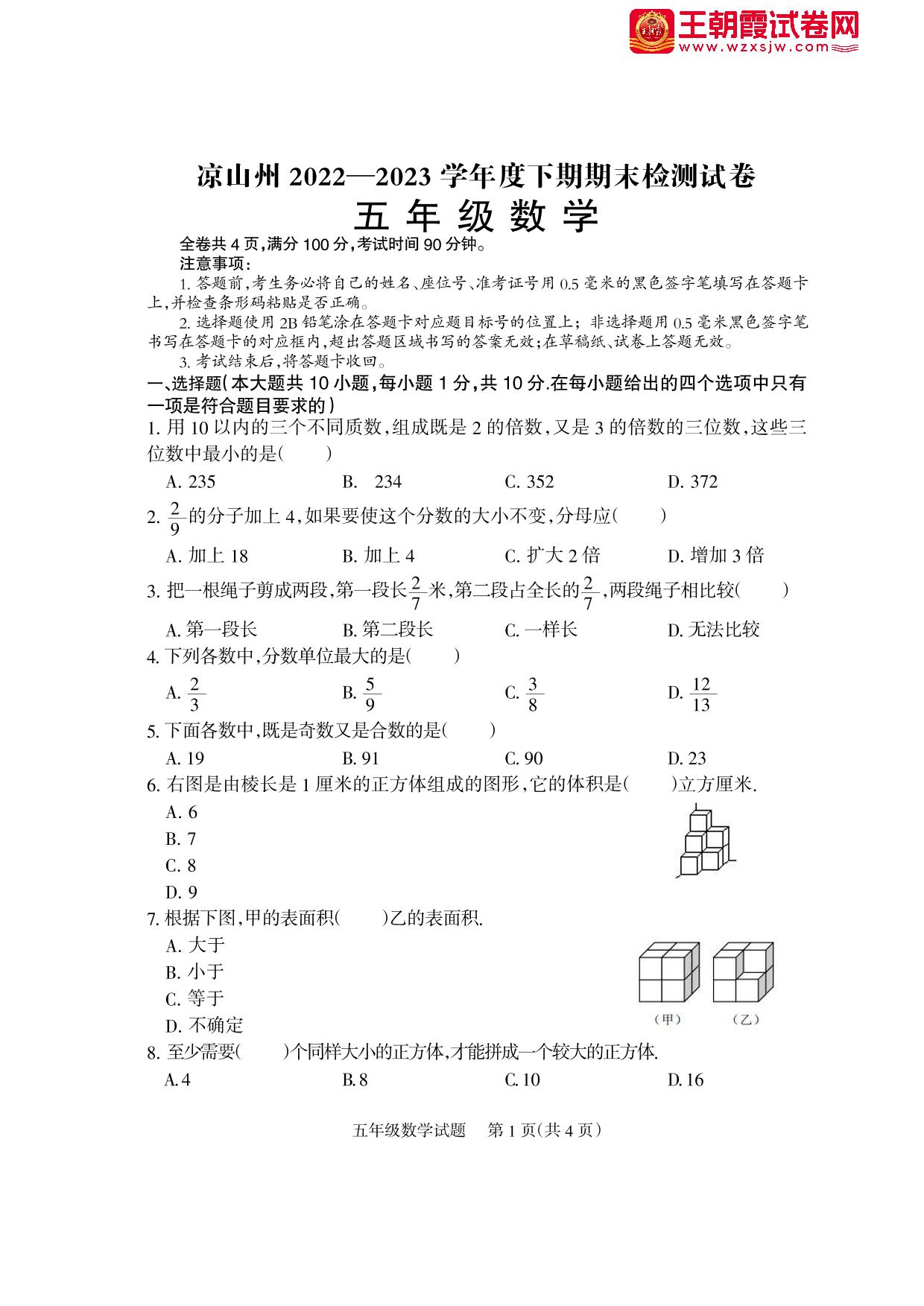 四川省凉山彝族自治州2022-2023学年度下学期期末检测试卷五年级数学(人教版)