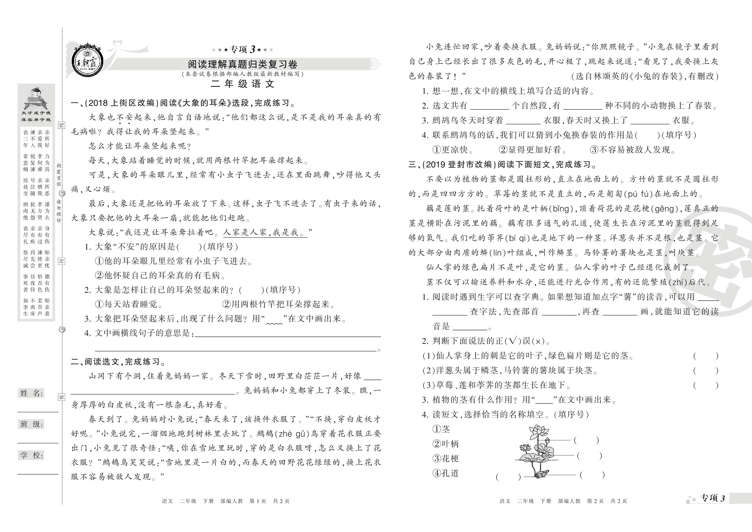 王朝霞期末专项卷——阅读理解、写话真题归类复习卷二年级下册语文(人教版)_R21080170049【0】