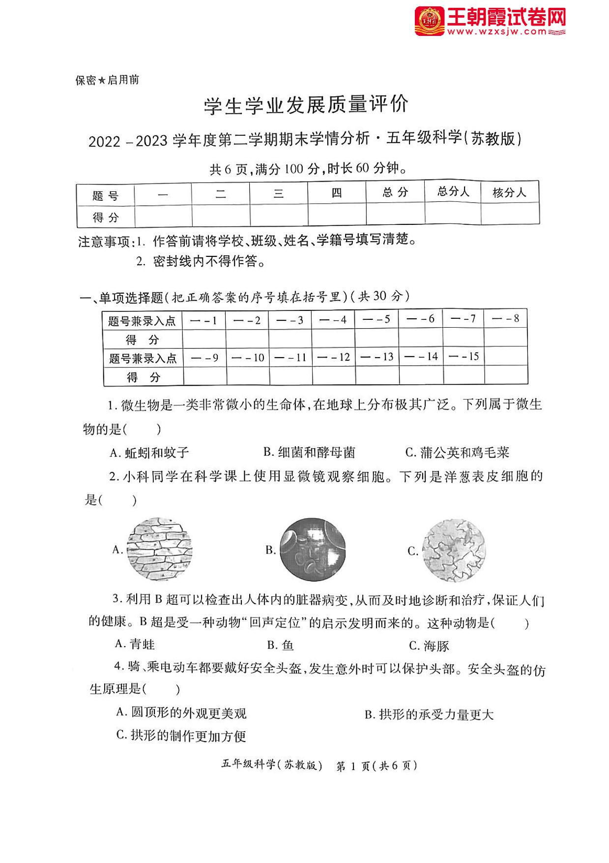 四川省绵阳市经开区2022-2023学年度第二学期期末学情分析试卷五年级科学(苏教版)