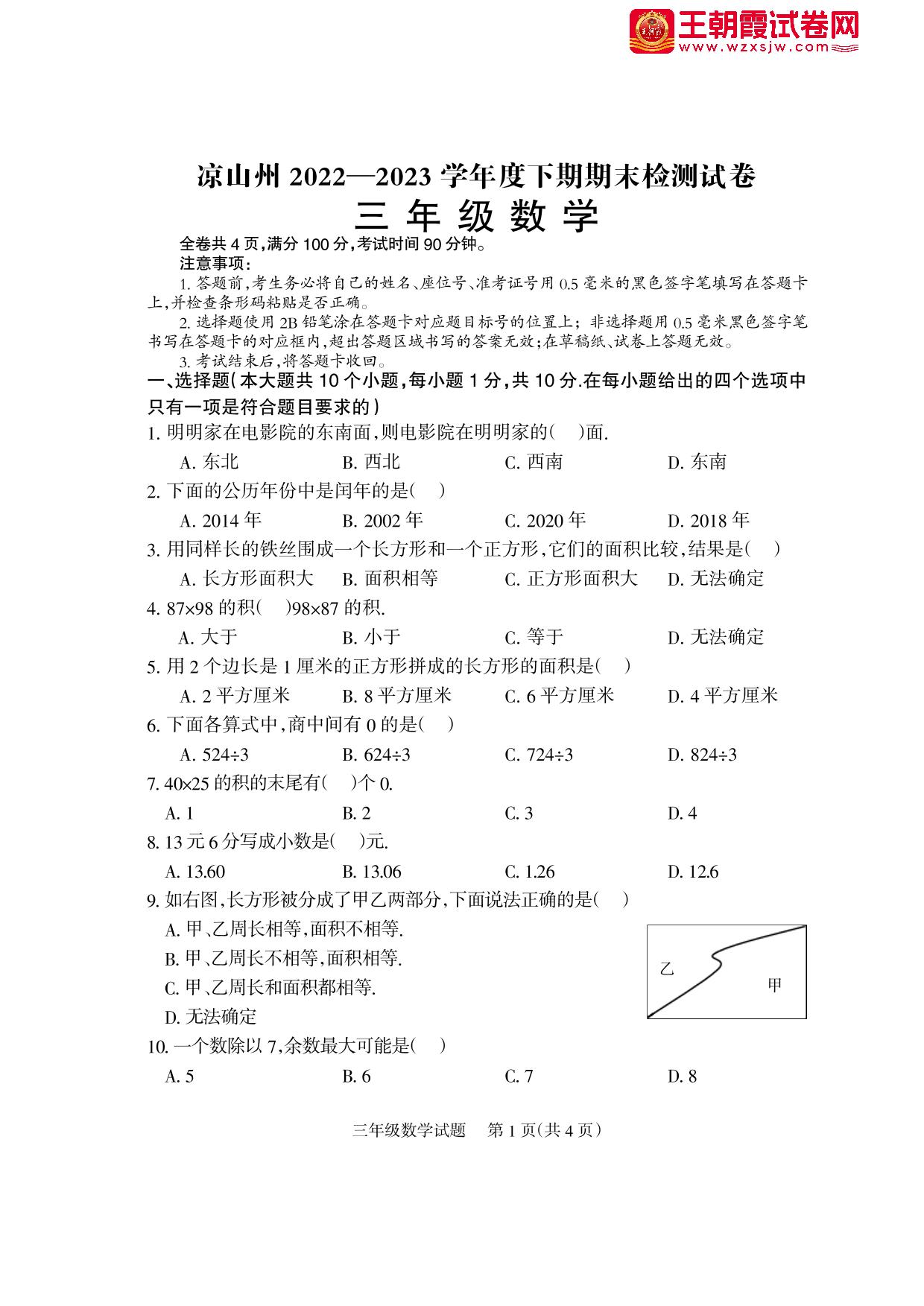 四川省凉山彝族自治州2022-2023学年度下学期期末检测试卷三年级数学(人教版)