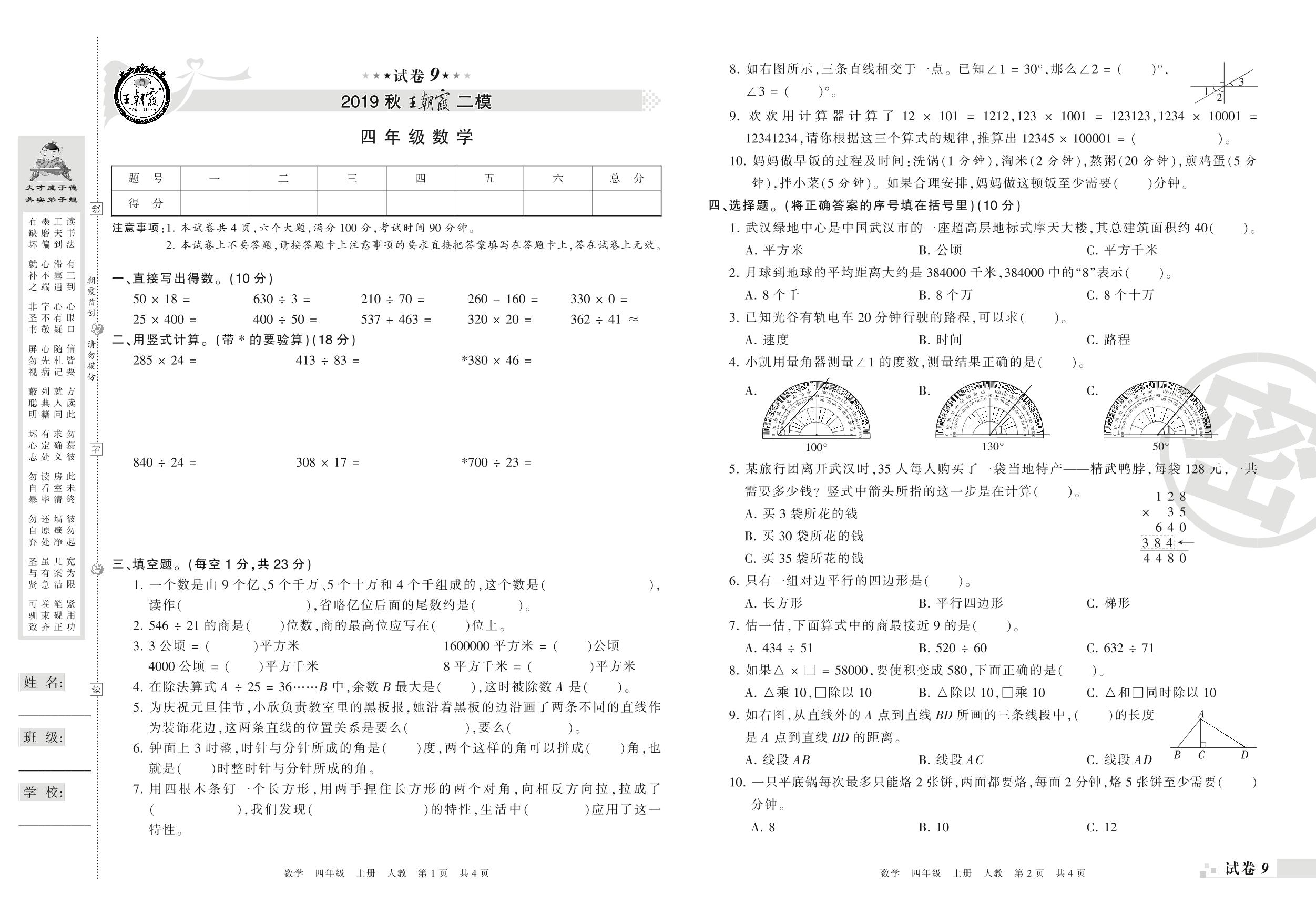 王朝霞期末模拟卷四年级上册数学(人教版)_R210804150115【9】