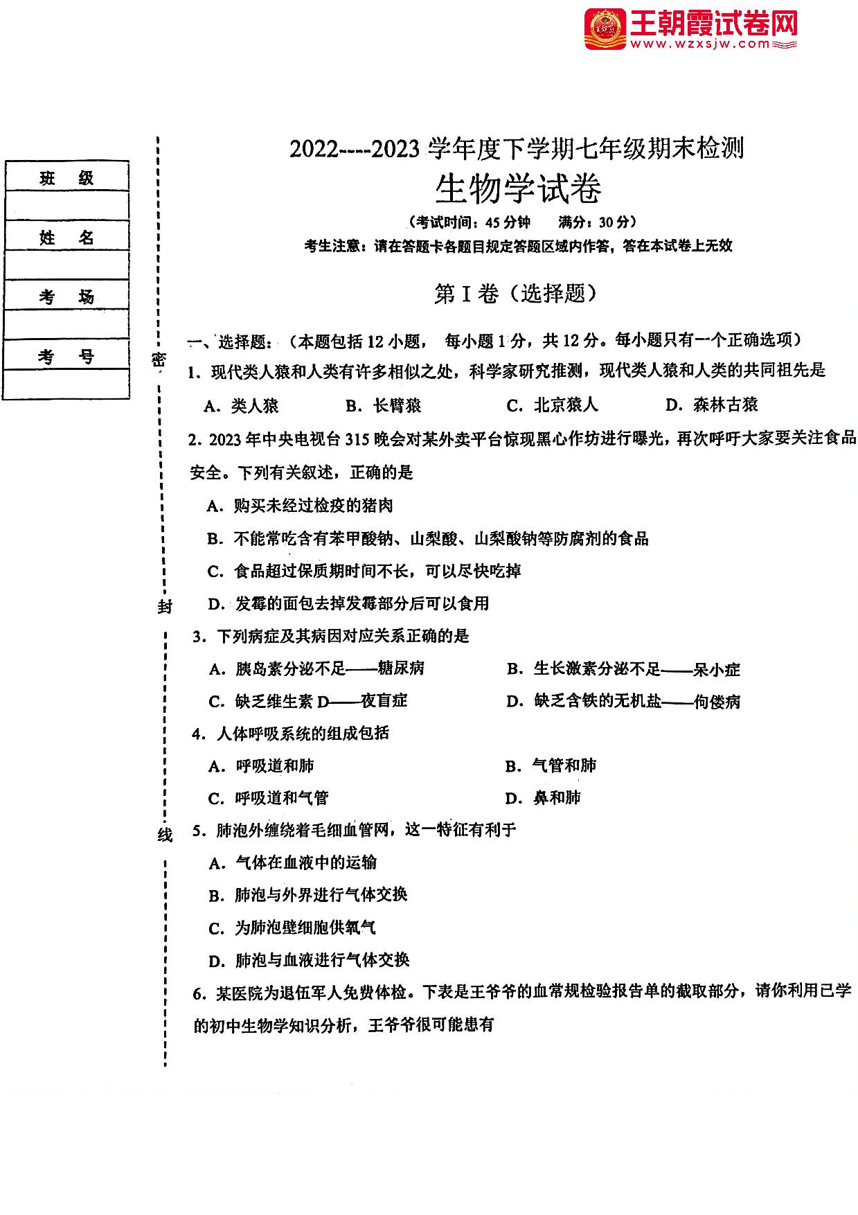 辽宁省葫芦岛市建昌县2022-2023学年度下学期期末检测七年级生物(人教版)