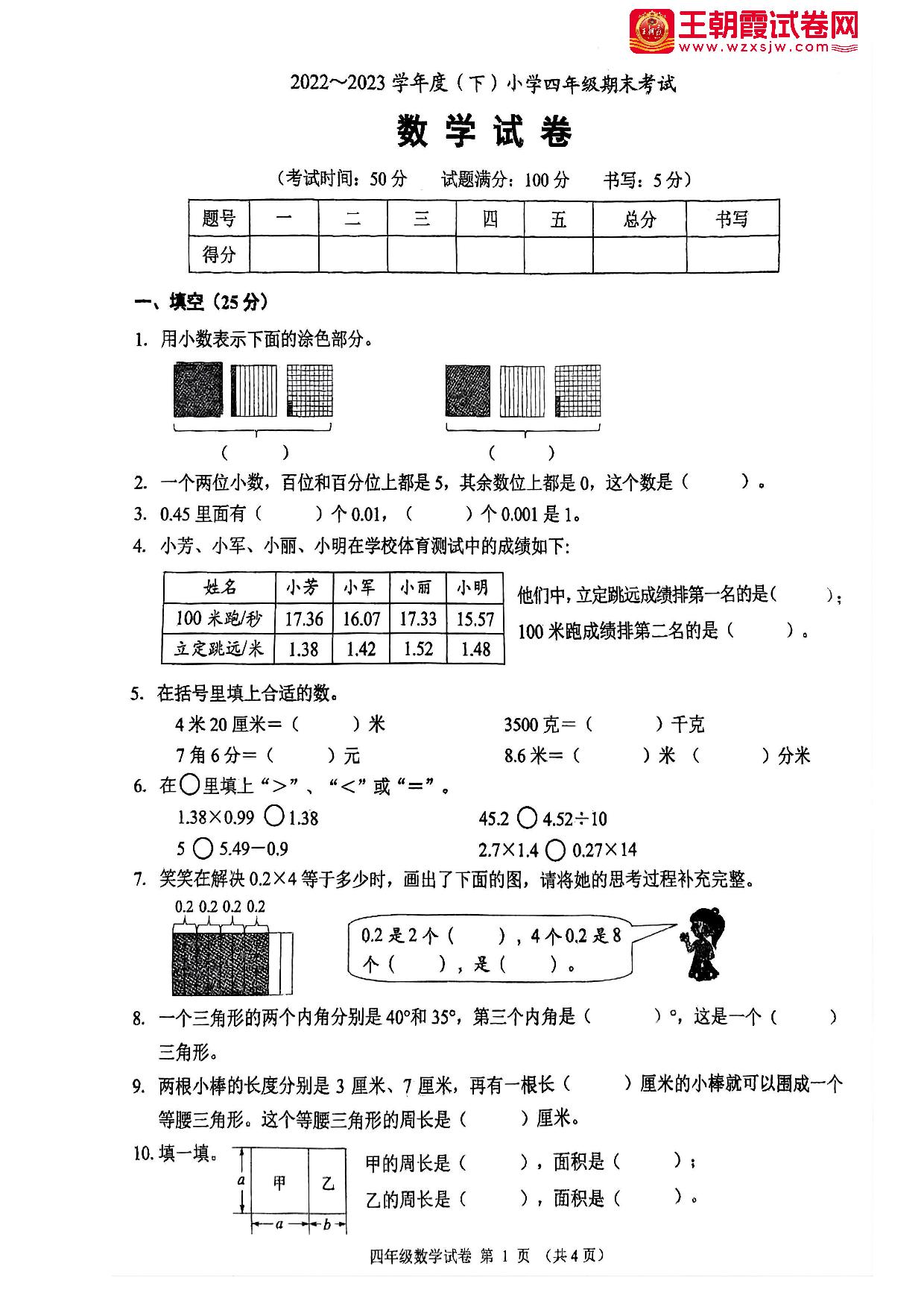 辽宁省锦州市2022-2023学年度下学期期末考试四年级数学(北师版)
