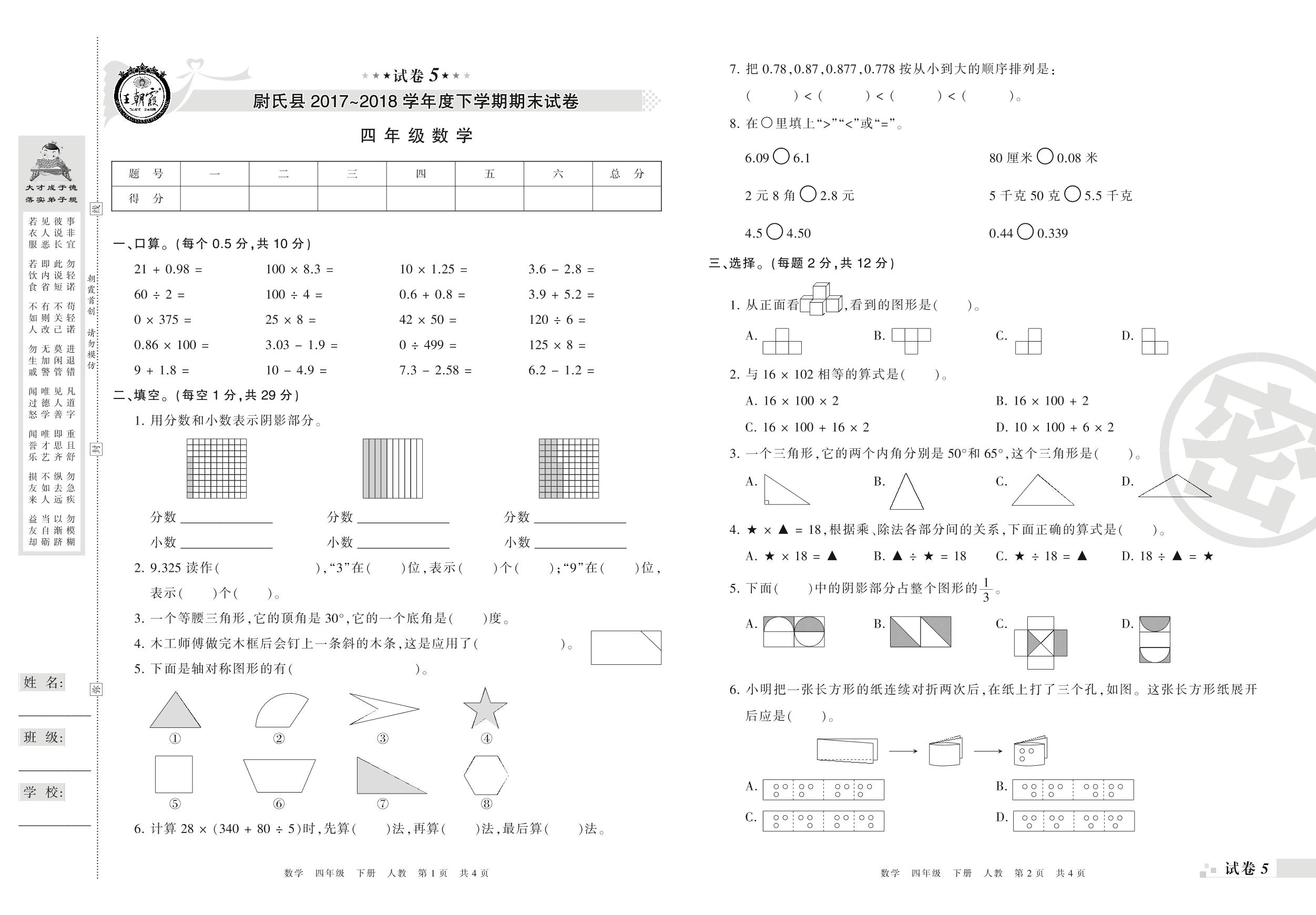 2017-2018学年第二学期开封市尉氏县四年级数学试卷(人教版)【5】