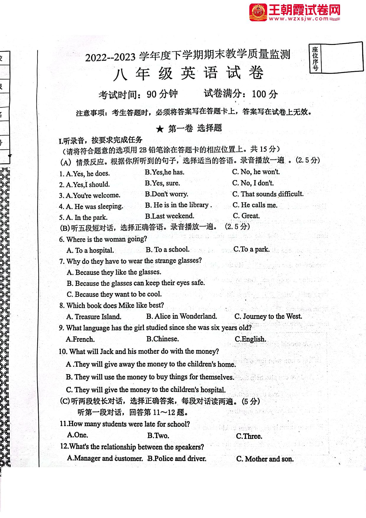 辽宁省丹东市东港市2022-2023学年度下学期期末教学质量监测八年级英语(人教版)【无听力音频】