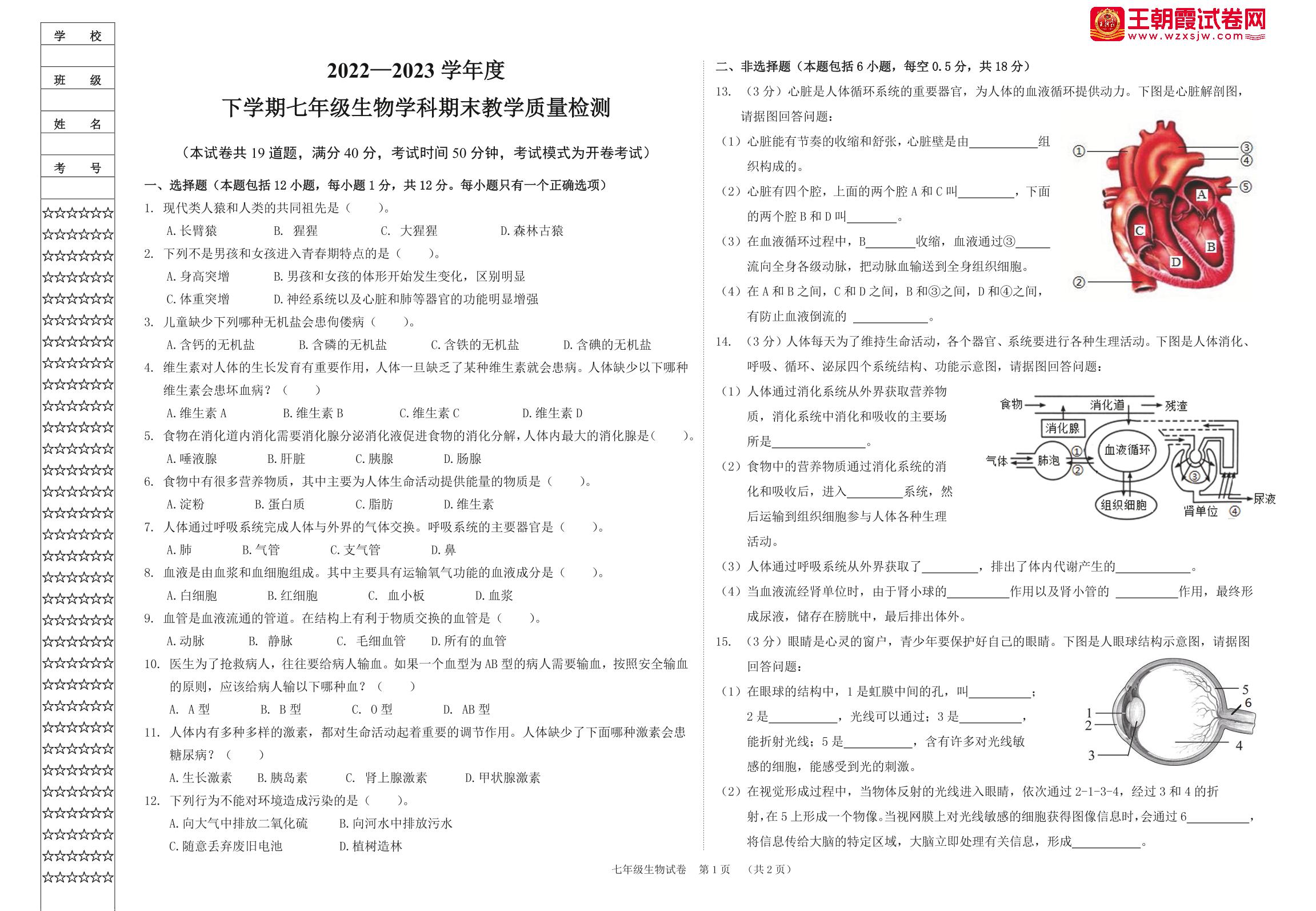 辽宁省营口市大石桥市2022-2023学年度下学期期末教学质量检测七年级生物(人教版)