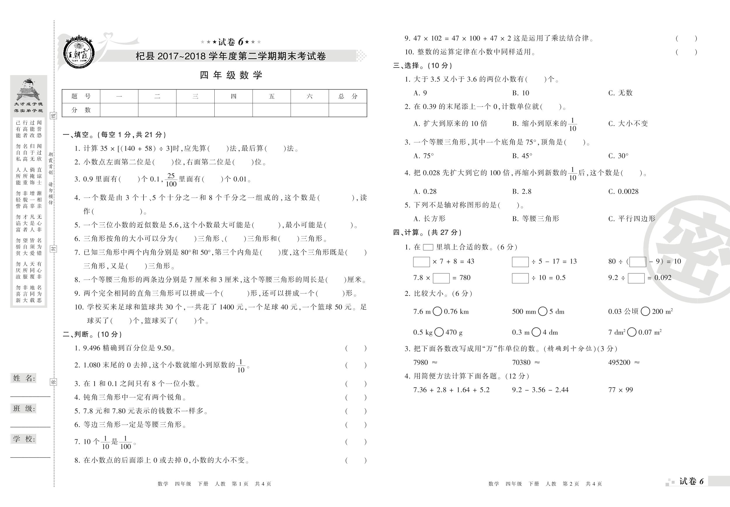 2017-2018学年第二学期开封市杞县四年级数学试卷(人教版)【6】
