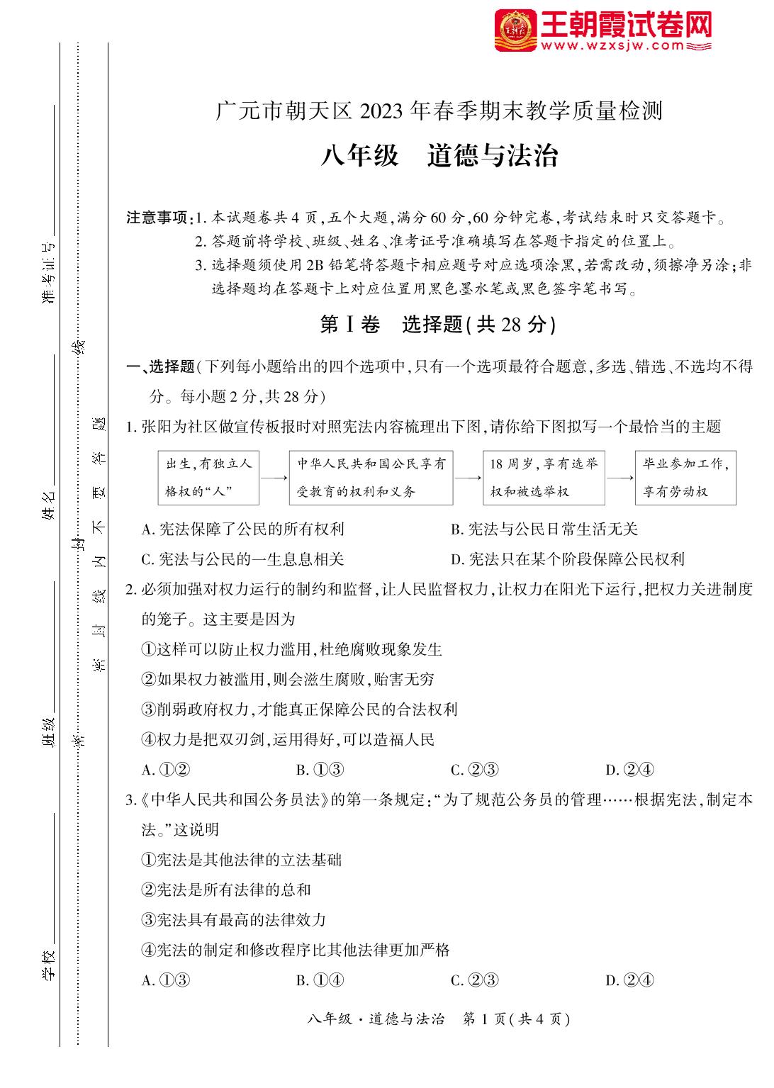 四川省广元市朝天区2022-2023学年度第二学期期末教学质量检测试卷八年级道德与法治(人教版)