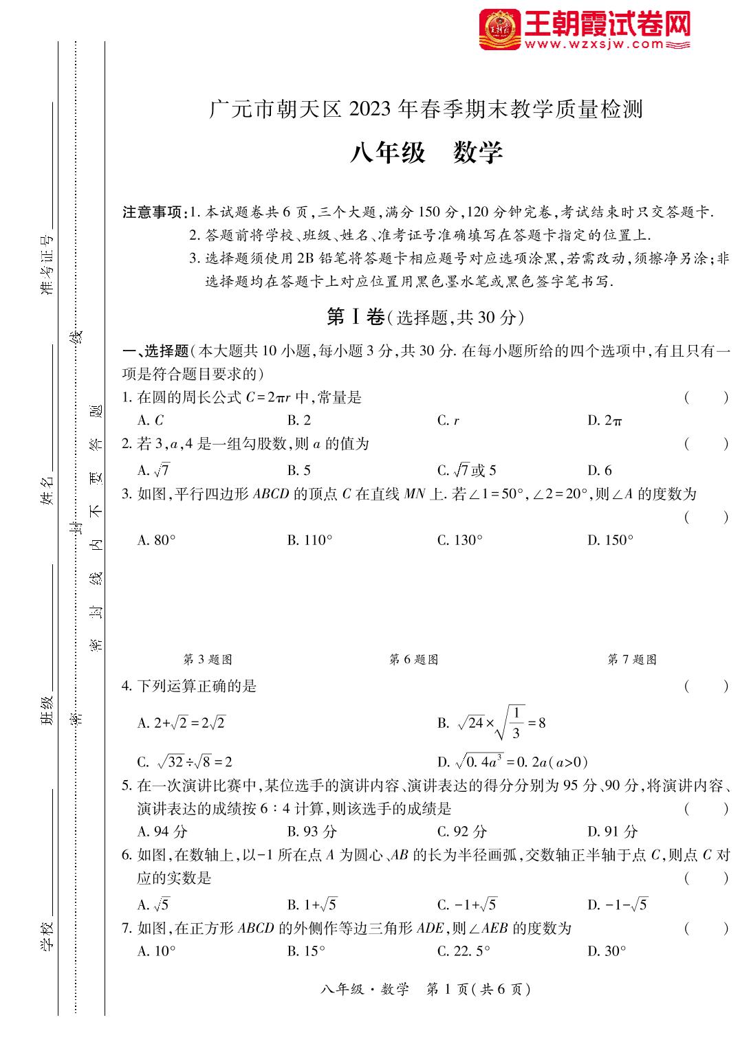 四川省广元市朝天区2022-2023学年度第二学期期末教学质量检测试卷八年级数学(人教版)