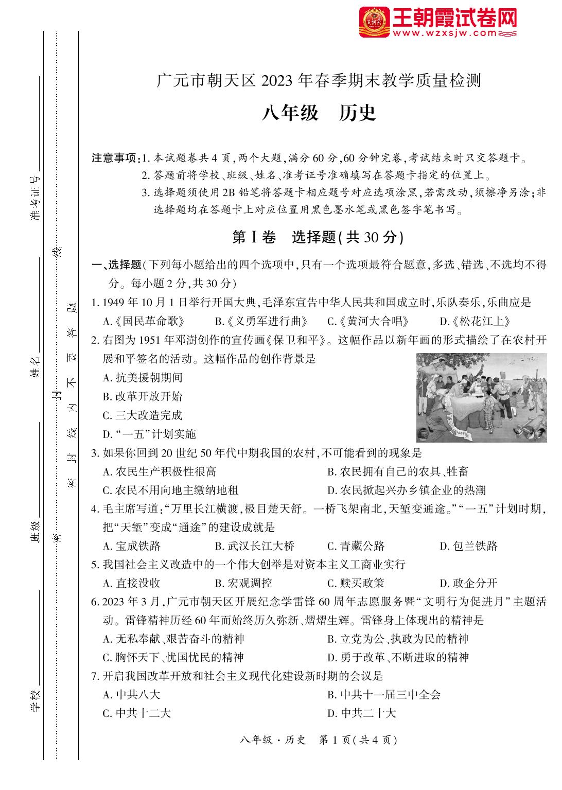 四川省广元市朝天区2022-2023学年度第二学期期末教学质量检测试卷八年级历史(人教版)
