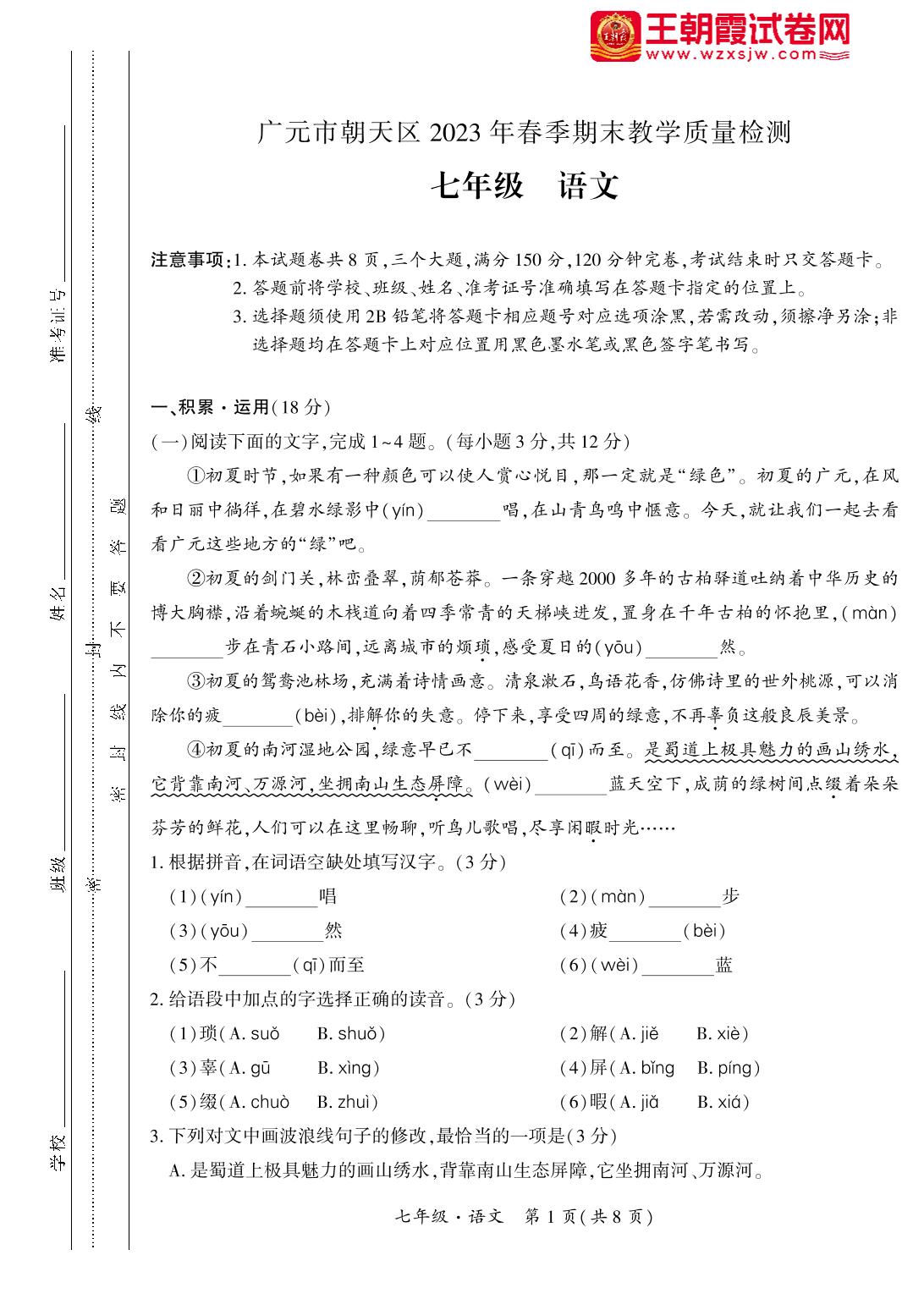 四川省广元市朝天区2022-2023学年度第二学期期末教学质量检测试卷七年级语文(人教版)
