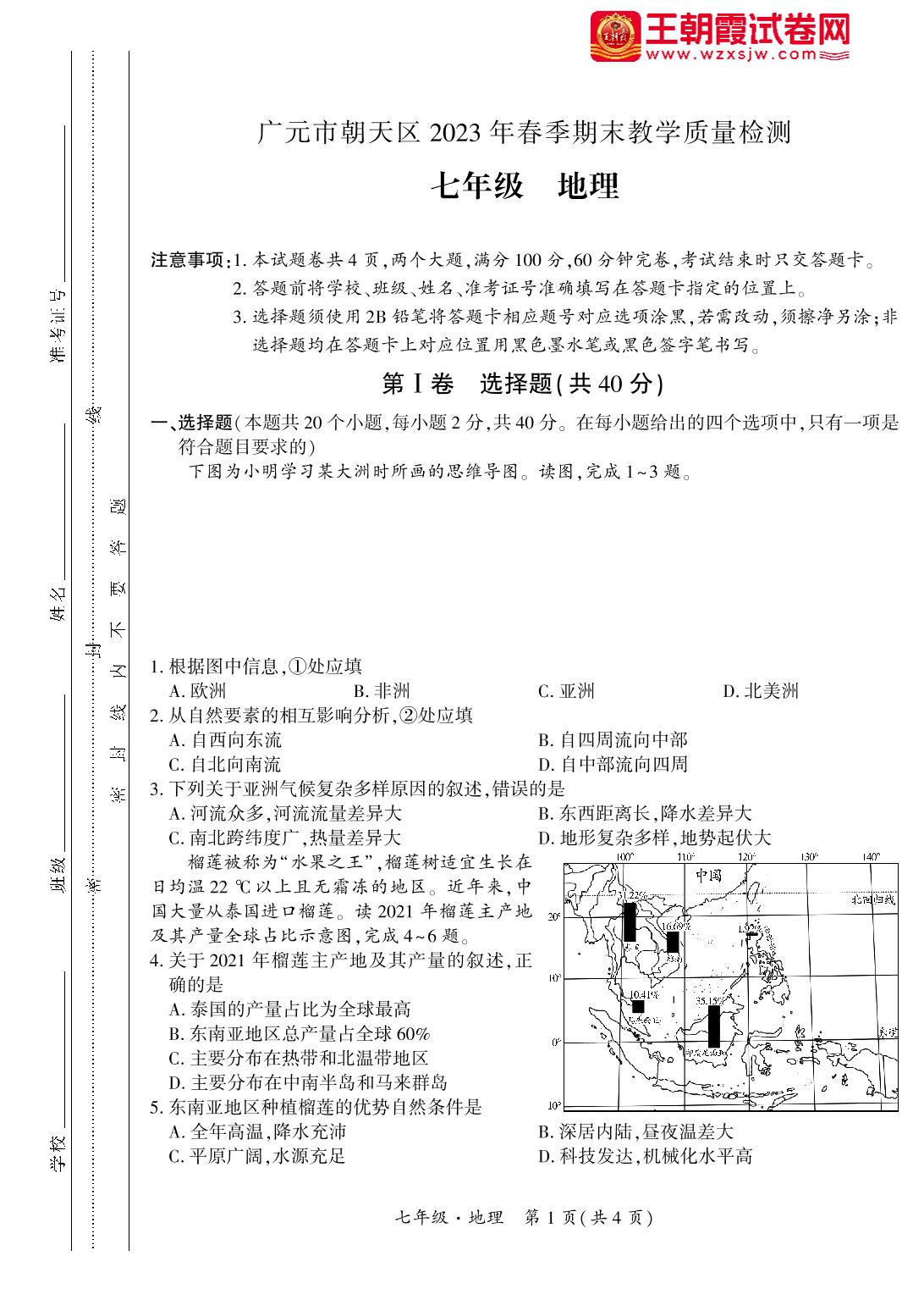四川省广元市朝天区2022-2023学年度第二学期期末教学质量检测试卷七年级地理(人教版)