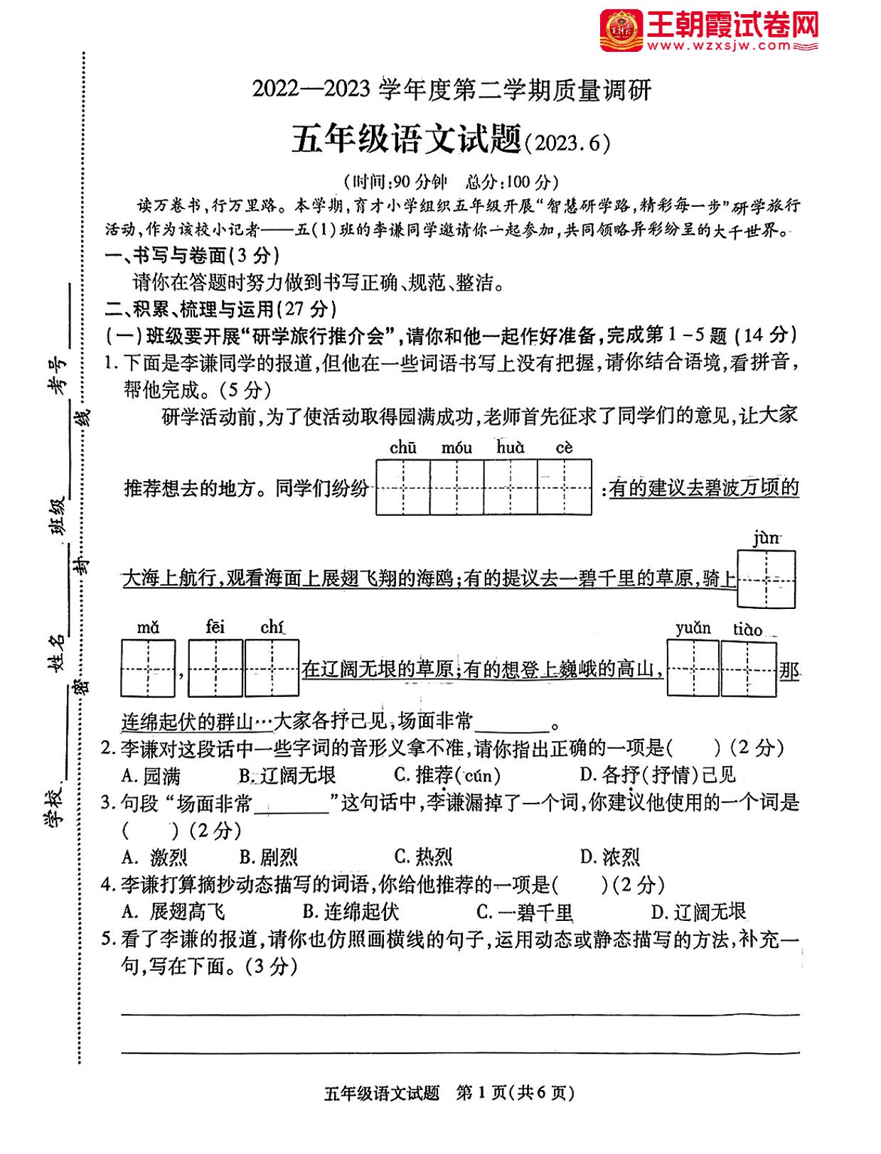 江苏省徐州市沛县2022-2023学年第二学期期末质量调研试题五年级语文(人教版)
