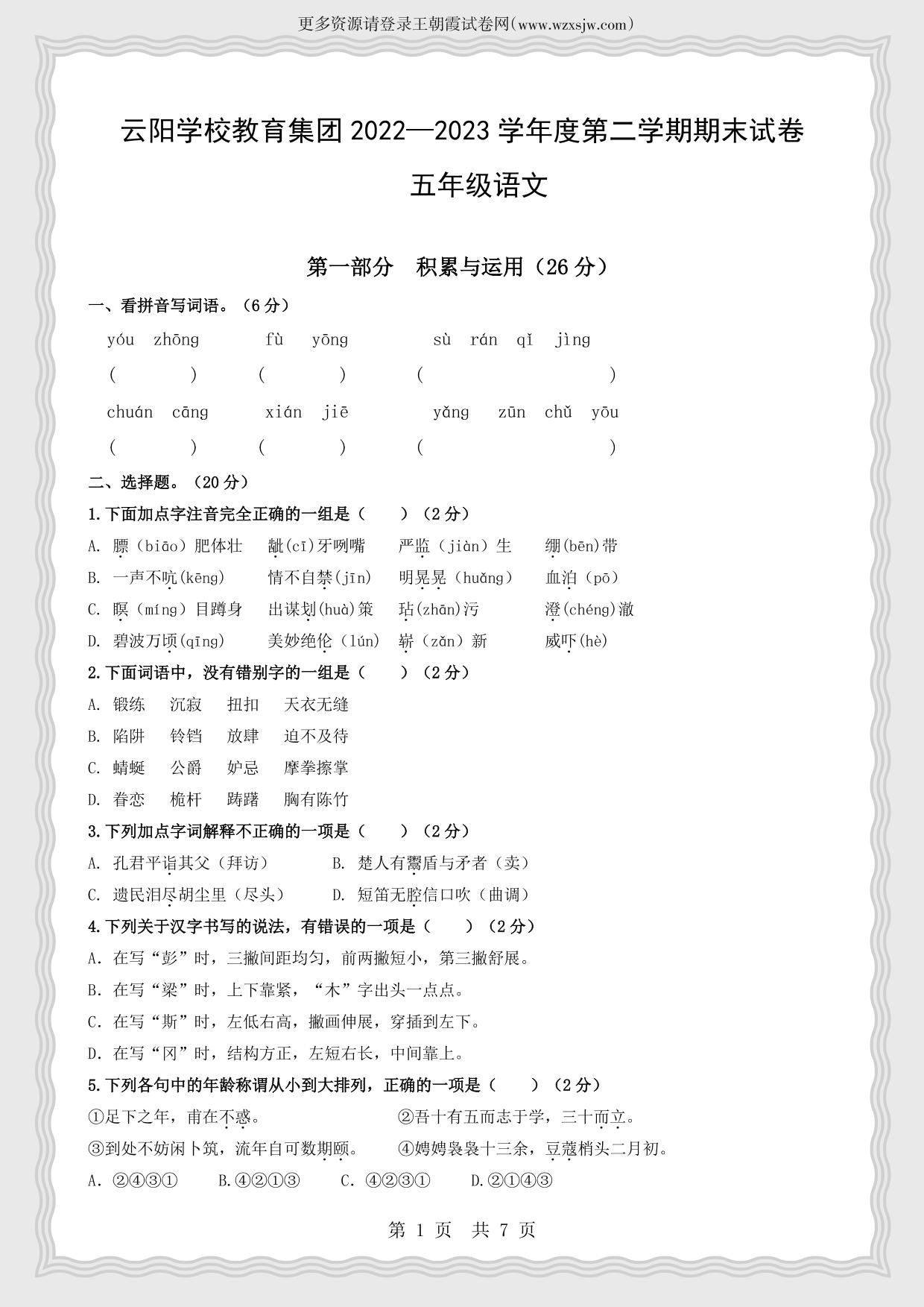 江苏省镇江市丹阳云阳学校教育集团2022—2023学年第二学期期末试卷五年级语文(人教版)