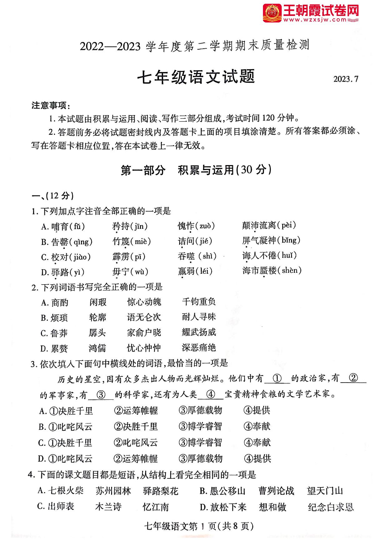 山东省潍坊市潍城区2022-2023学年度第二学期期末质量检测七年级语文(人教版)