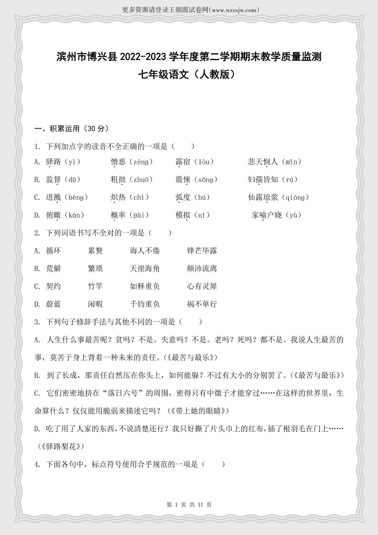 山东省滨州市博兴县2022-2023学年度第二学期期末教学质量监测七年级语文(人教版)