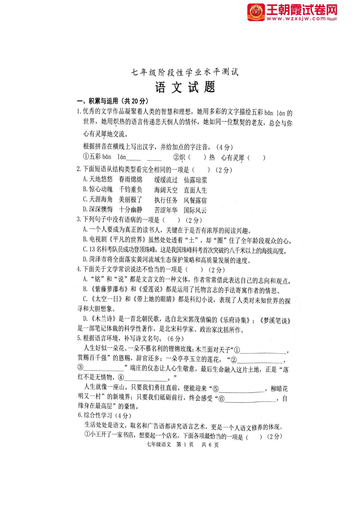 山东省菏泽市牡丹区2022-2023学年下学期期末阶段性学业水平测试七年级语文(人教版)