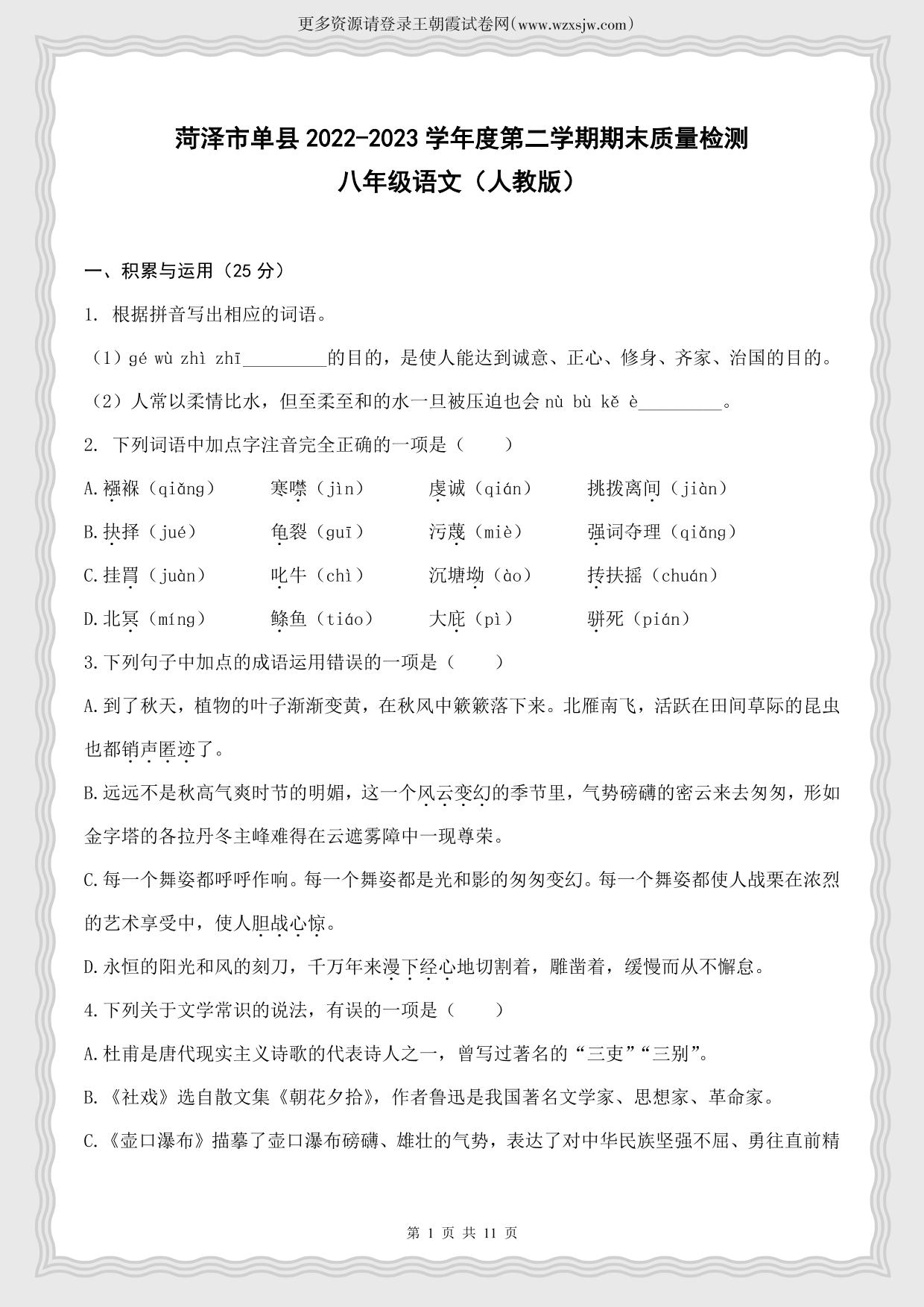 山东省菏泽市单县2022-2023学年度第二学期期末质量检测八年级语文(人教版)