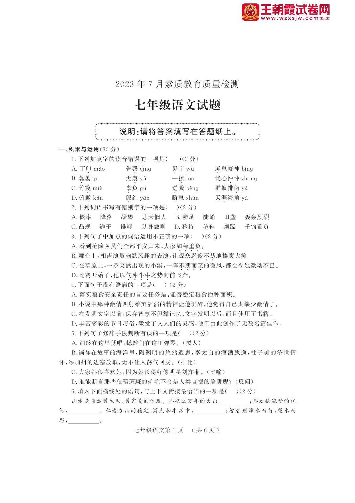 山东省菏泽市曹县2022-2023学年7月期末素质教育质量检测七年级语文(人教版)