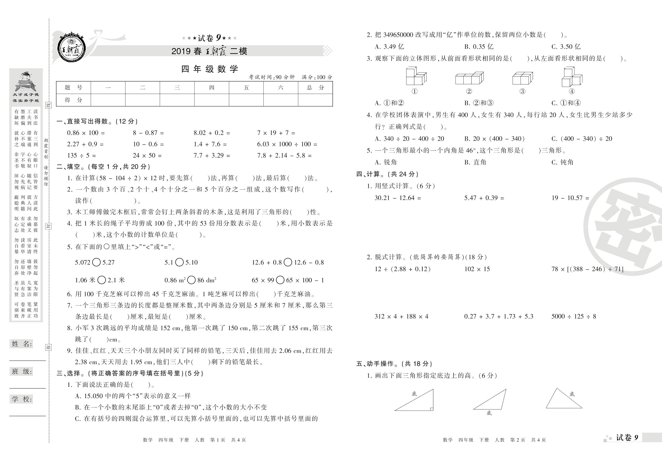 王朝霞期末模拟卷四年级下册数学(人教版)_R210804150131【9】