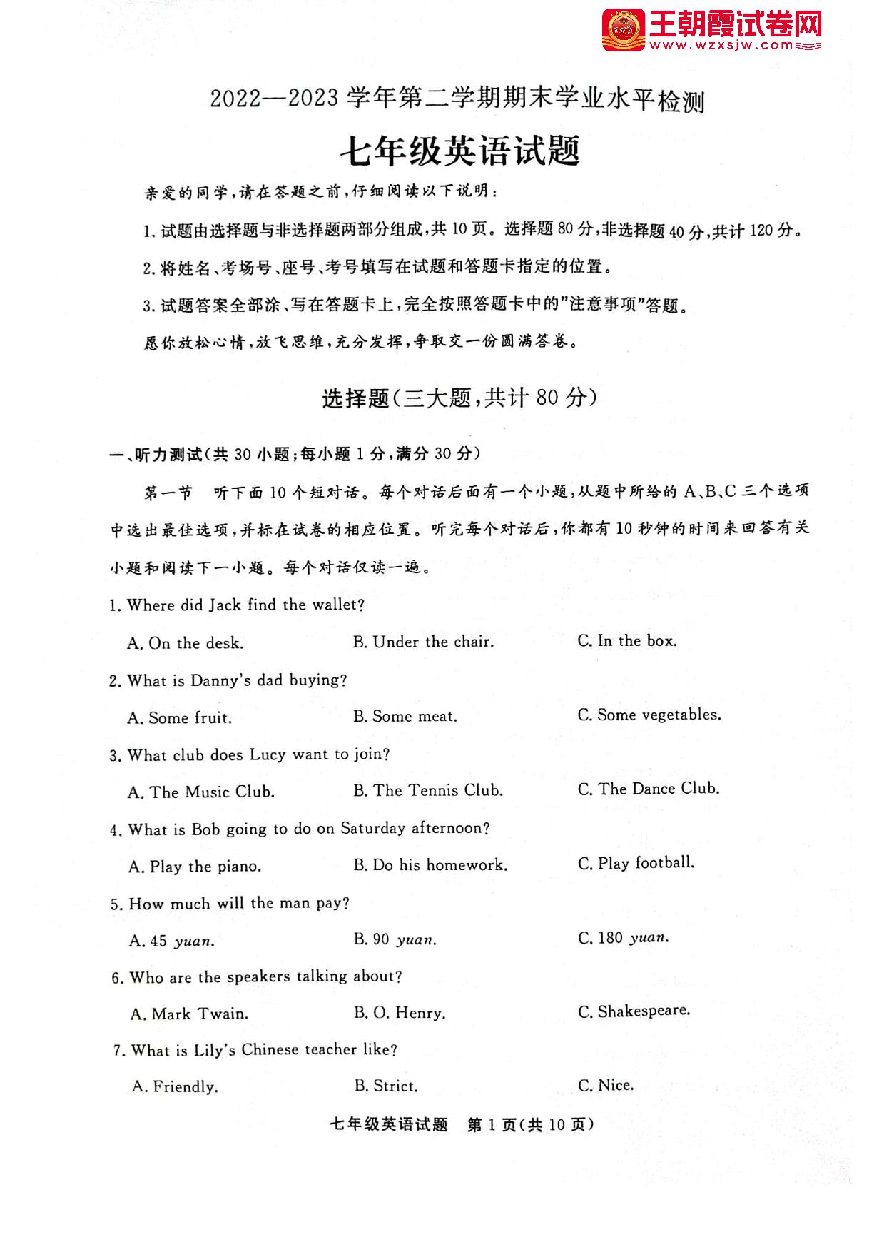 山东省聊城市东昌府区2022-2023学年第二学期期末学业水平检测七年级英语(外研版)【无听力音频】