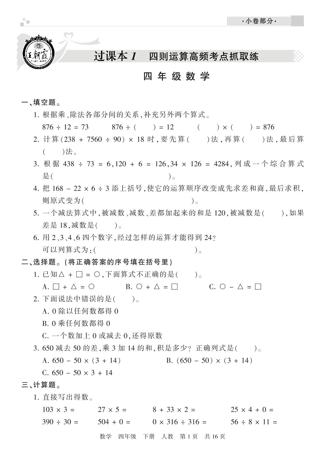 王朝霞期末过课本四年级下册数学(人教版)_R210804150134【0】