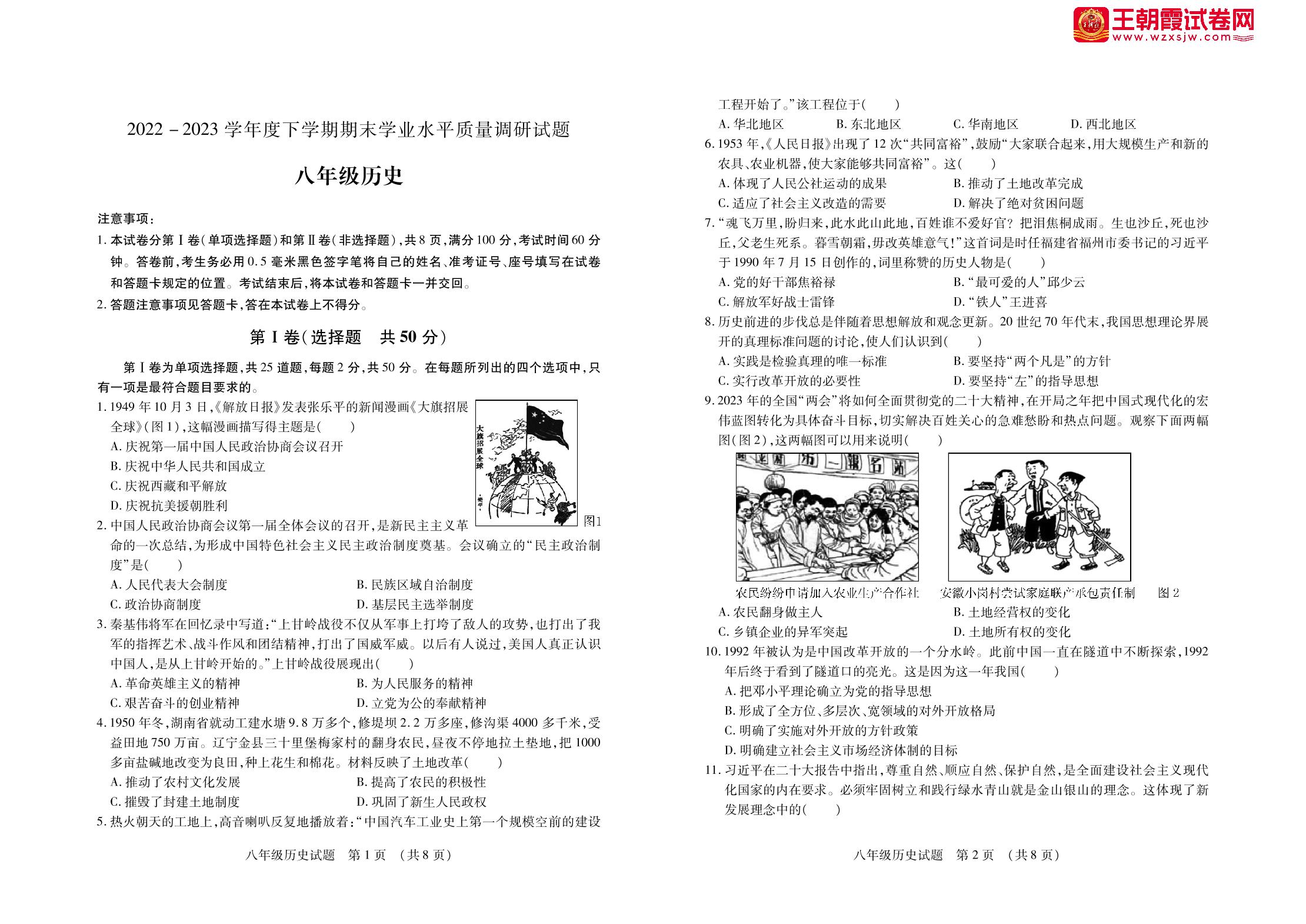 山东省临沂市河东区2022-2023学年度下学期期末学业水平质量调研试题八年级历史(人教版)